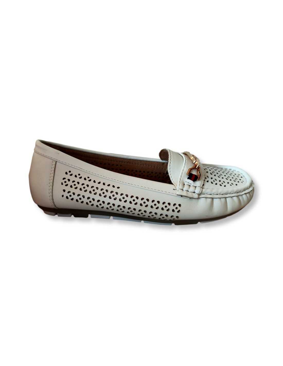Mocasín cómodo de material perforado, con adorno dorado en empeine.