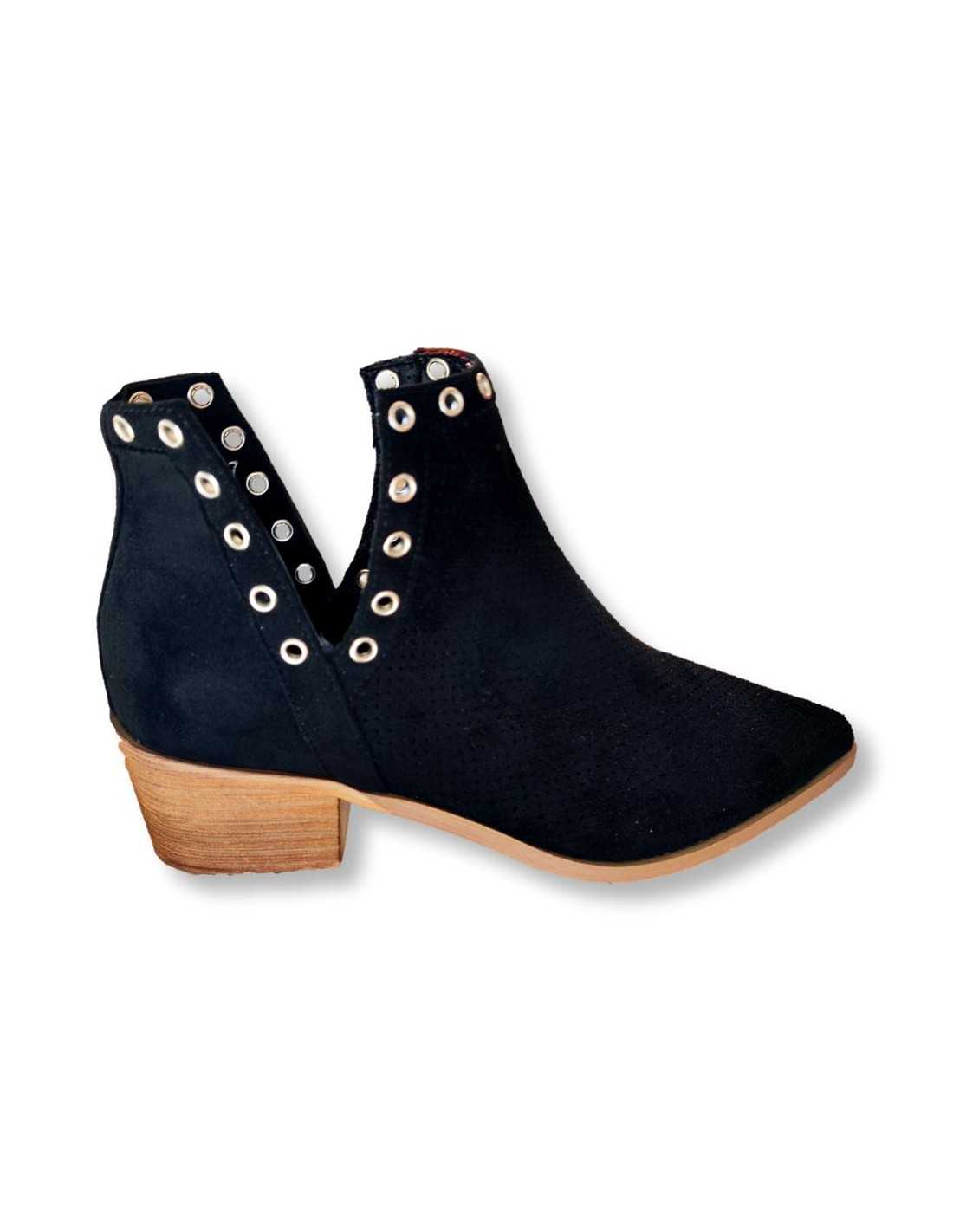 Botines calados con remaches decorativos a ambos lados, con apertura para fácil calzado.
