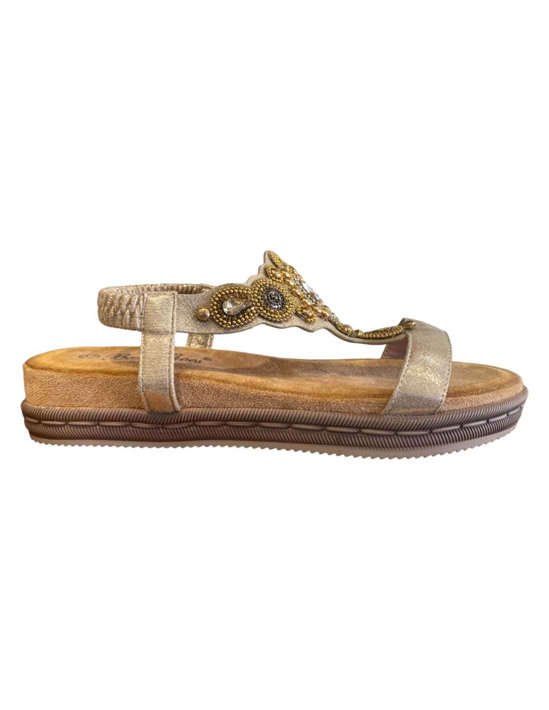 Sandalias planas con suela bio y empeine con pedrería de colores.