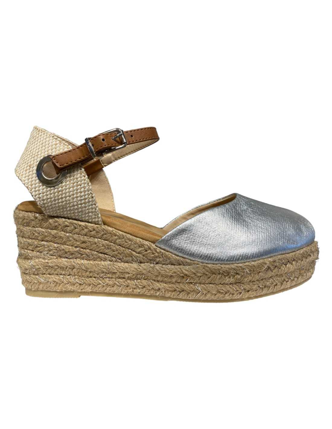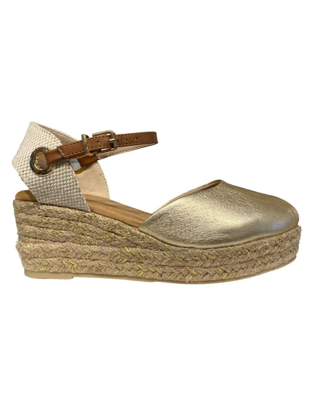 Cuñas con cierre de hebilla en tobillo y suela de yute.