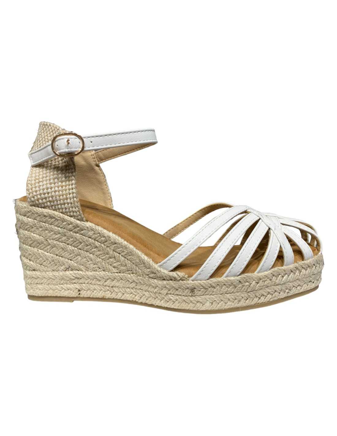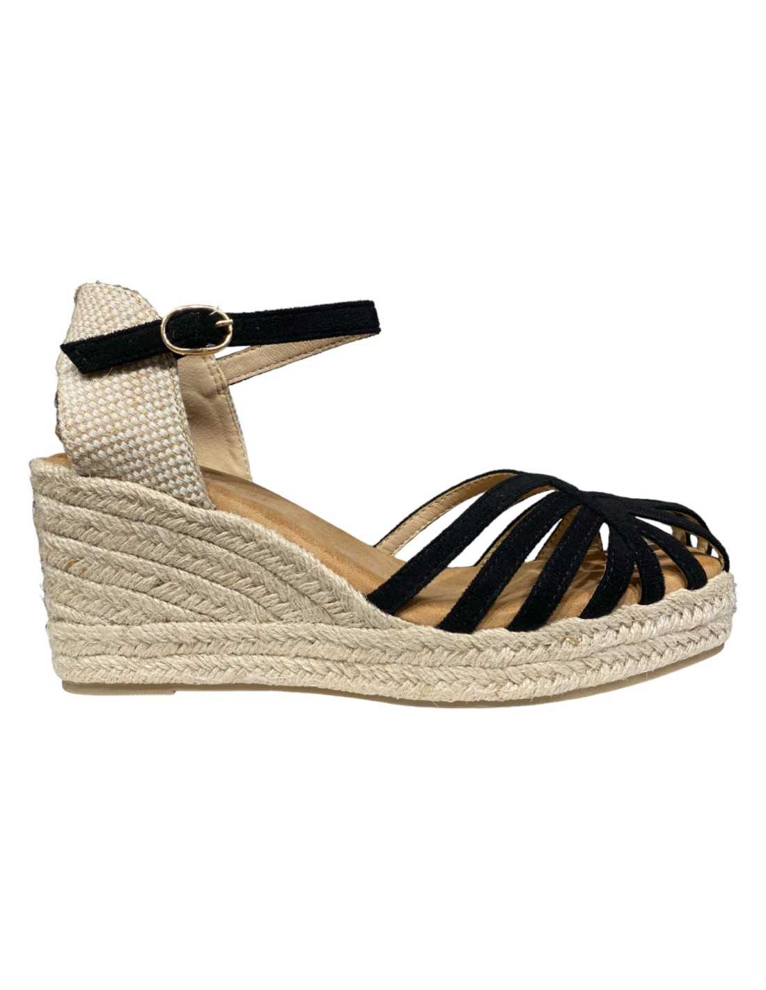 Cuñas con empeine a modo de cangrejera de tiras. Cierre de hebilla en tobillo.
