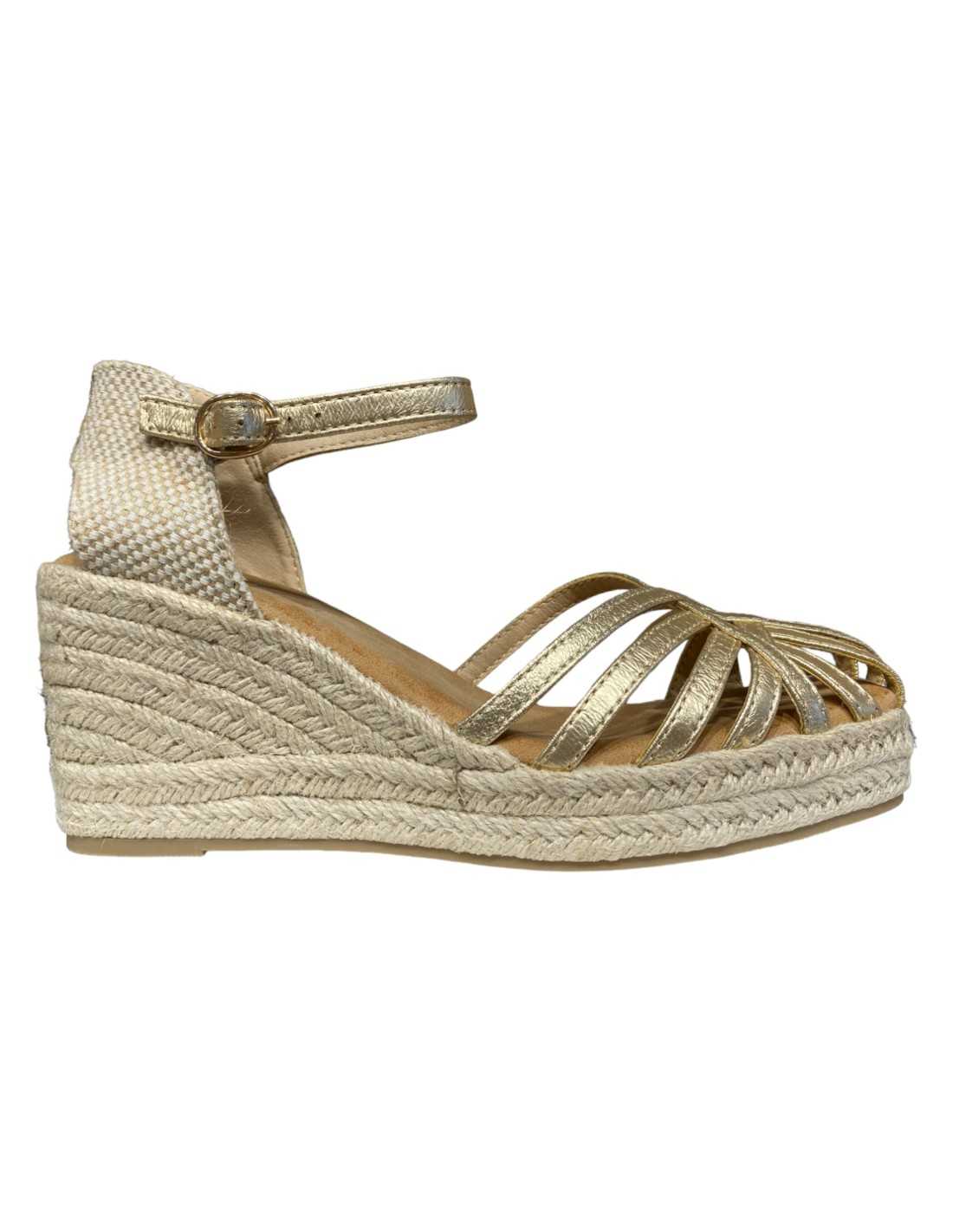 Cuñas con empeine a modo de cangrejera de tiras. Cierre de hebilla en tobillo.