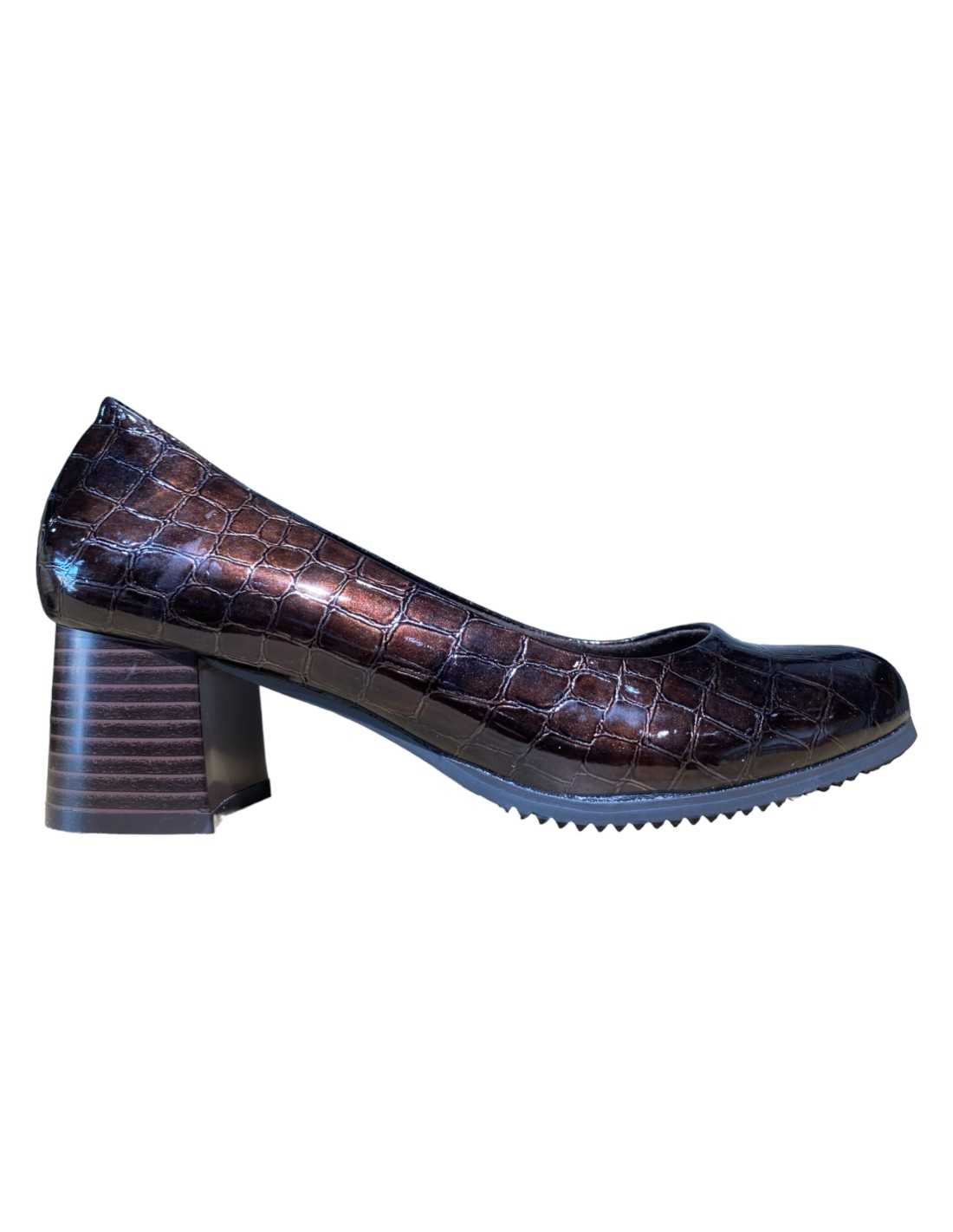 Zapatos de tacón cuadrado, en material grabado de cocodrilo con punta redonda.