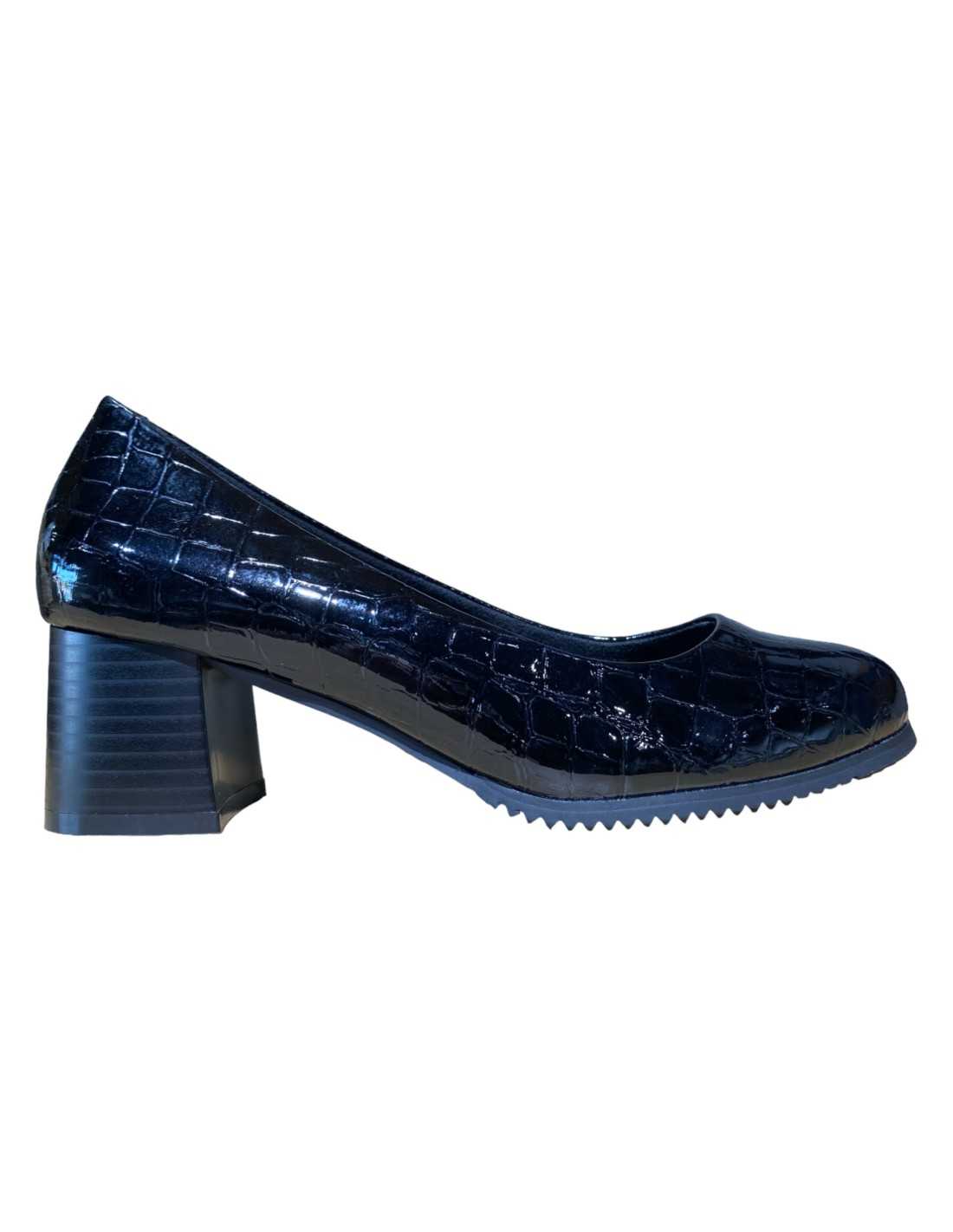 Zapatos de tacón cuadrado, en material grabado de cocodrilo con punta redonda.