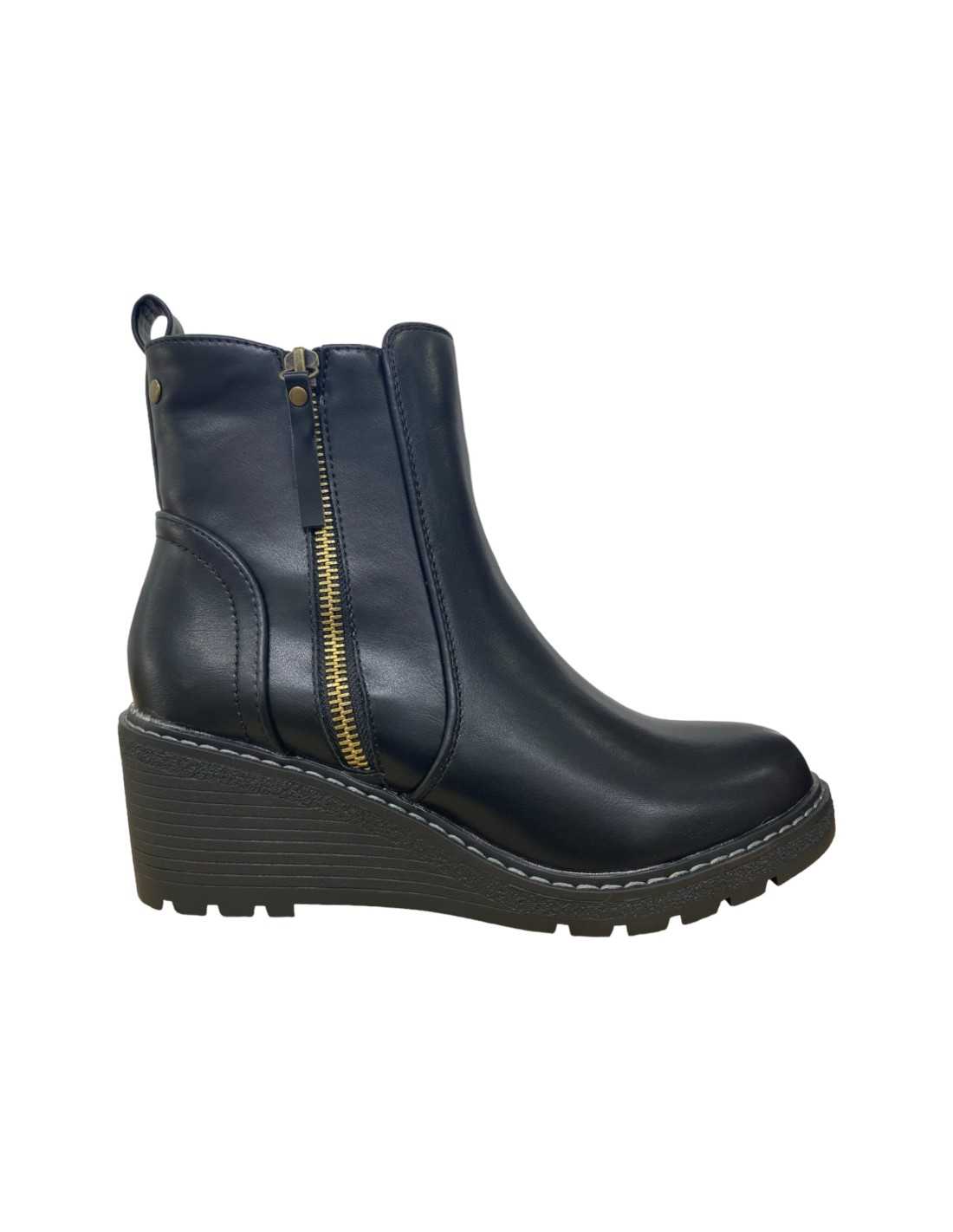 Botines de cuña con talón reforado y suela dentada. Punta redondeada y cremallera lateral.