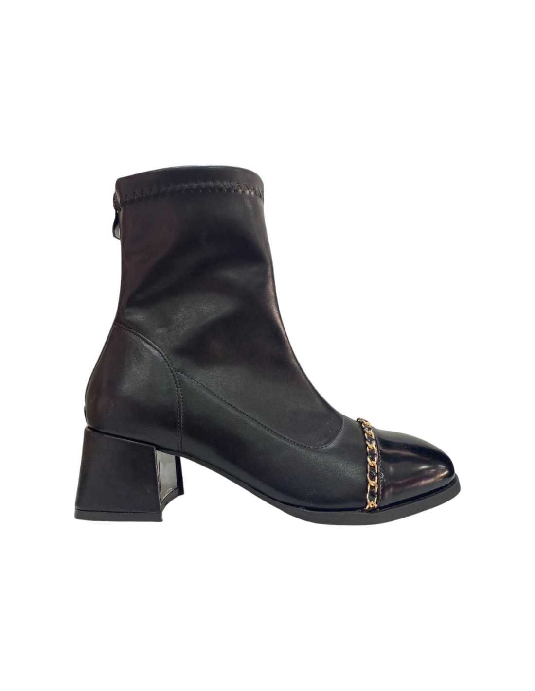 Botines con punta de charol negro y cremallera trasera de cierre. Tacón forrado cuadrado.