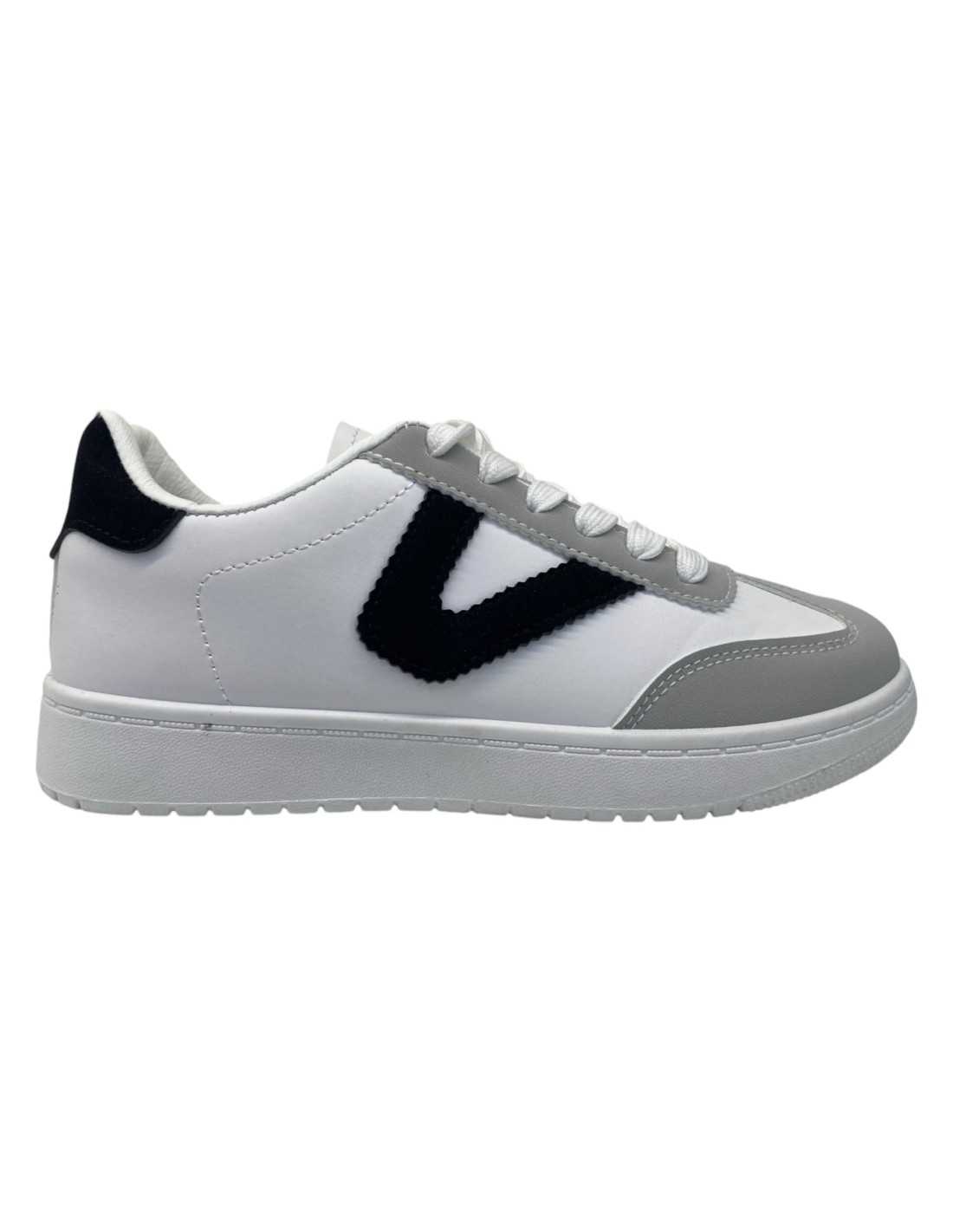 Deportivos con adorno triangular en lateral, a tono con talón y cierre de cordones. Puntera gris.