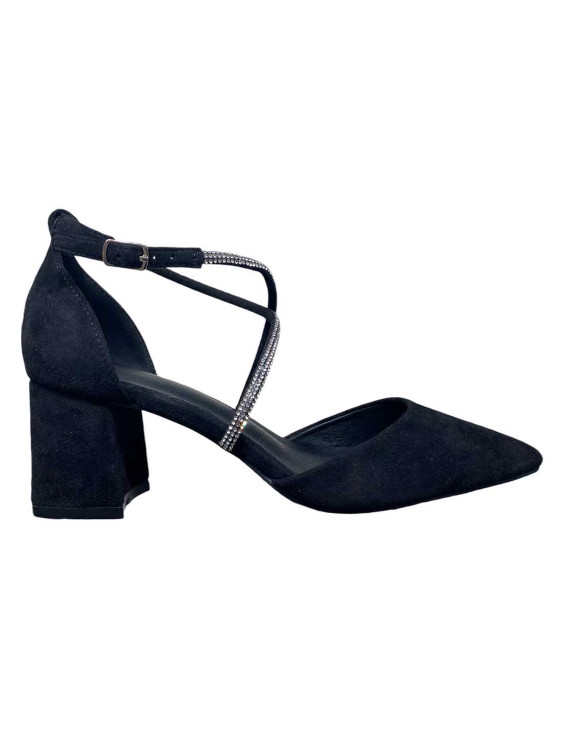 Zapatos de tacón cuadrado con punta fina y cruceta de strass en empeine. Cierre de hebilla en tobillo.