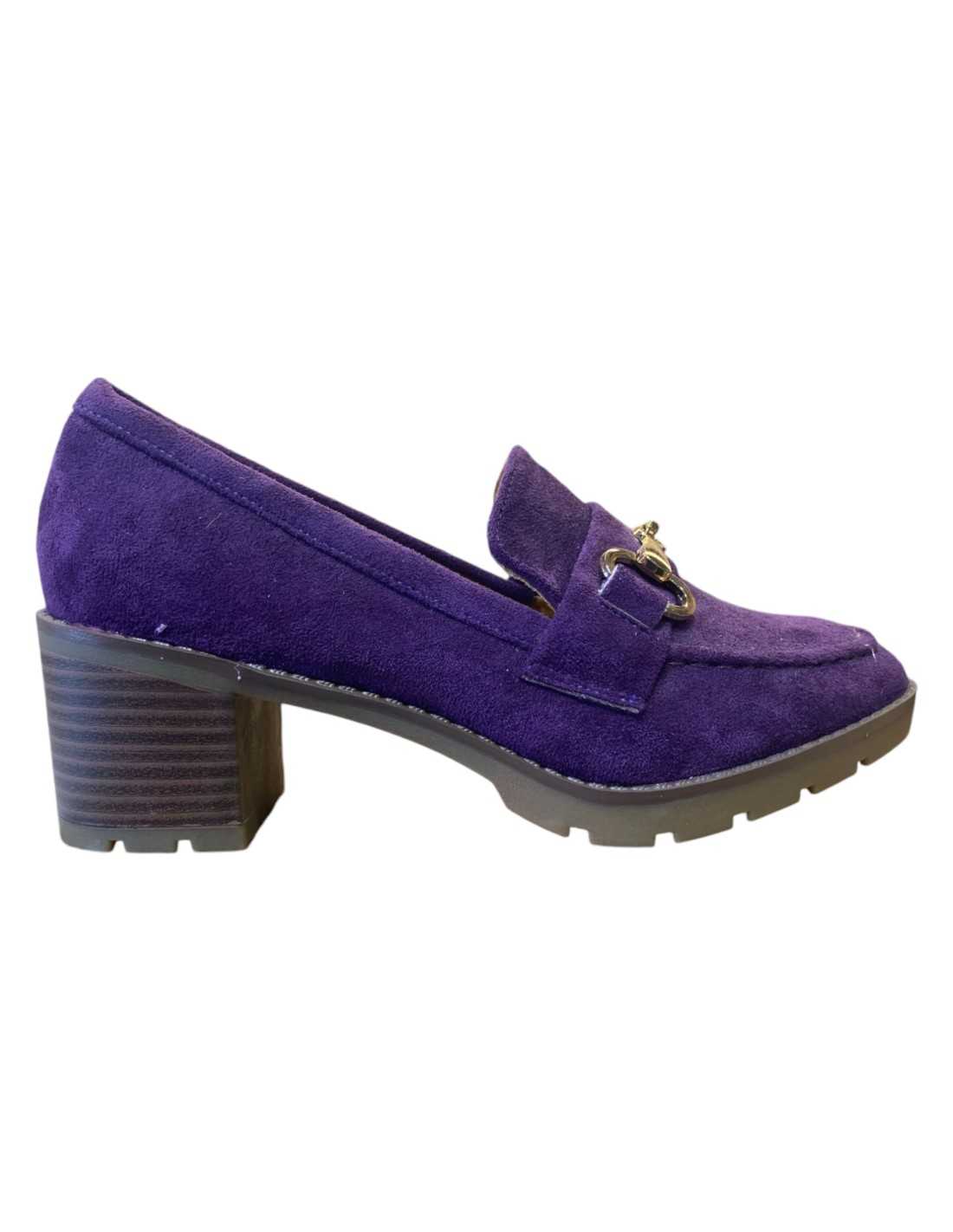 Mocasines de antelina con antifaz al tono, con adorno dorado. Suela y tacón dentados.