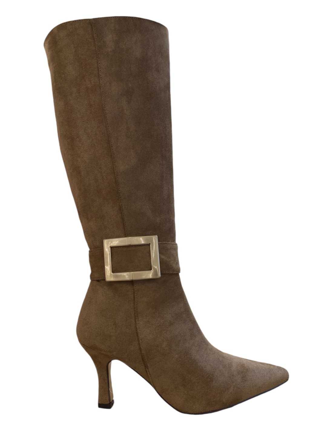 Botas de antelina con pulsera en tobillo al tono, con hebilla decorativa cuadrada en oro mate. Tacón y punta fina.
