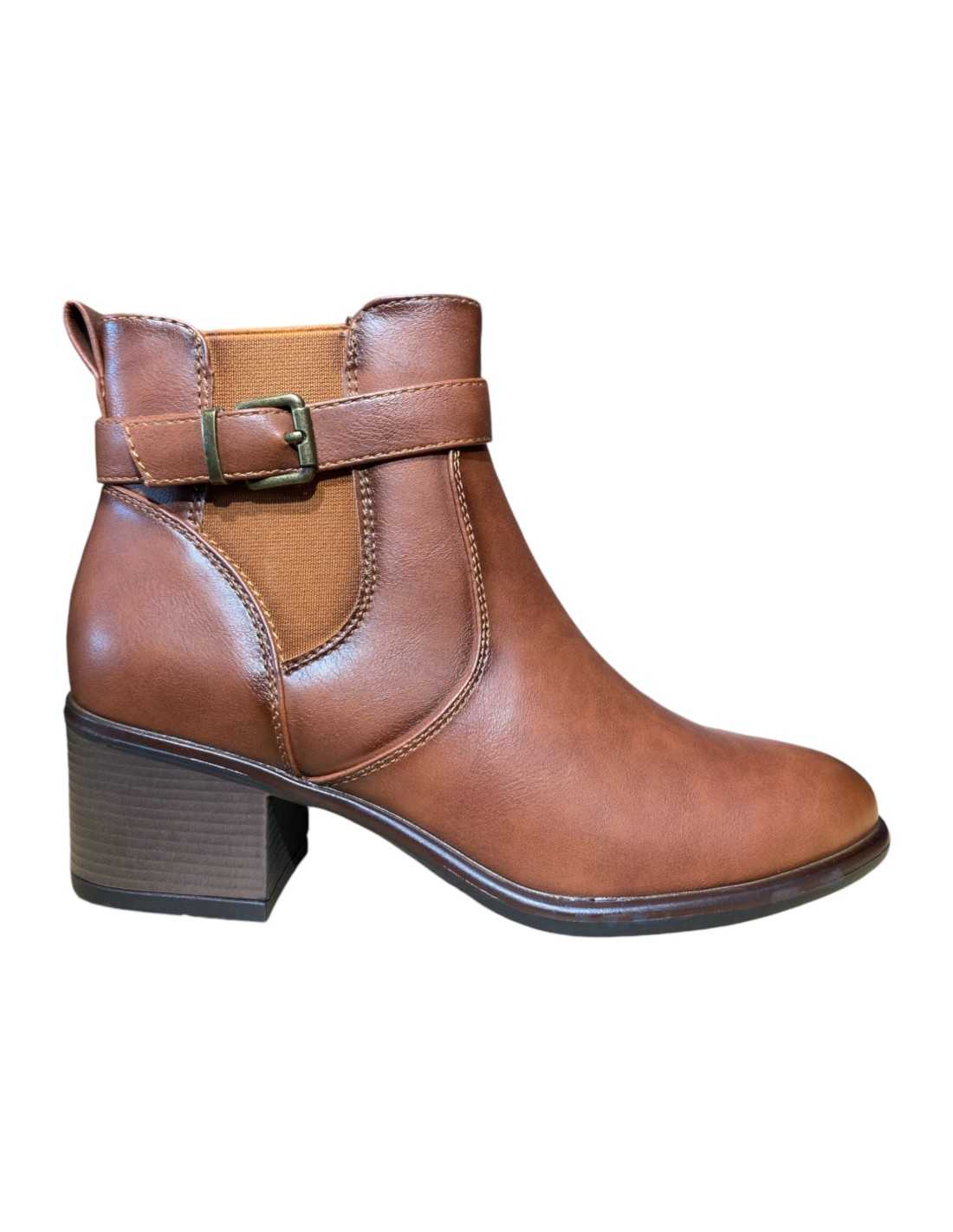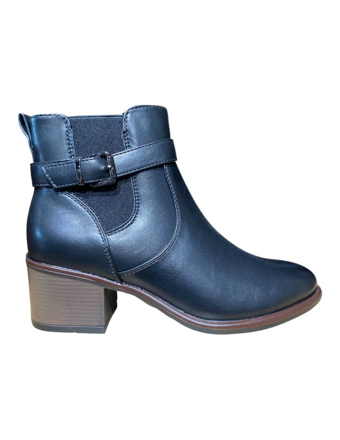 Botines con adorno de hebilla y elástico en tobillo, con cierre de cremallera y tacón cuadrado.