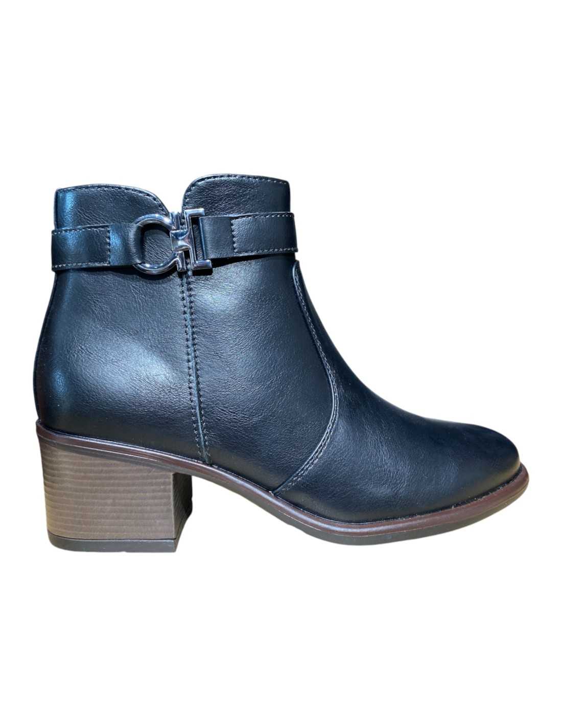 Botines de tacón con adorno en tobillo metálico, cierre de cremallera y punta redonda.