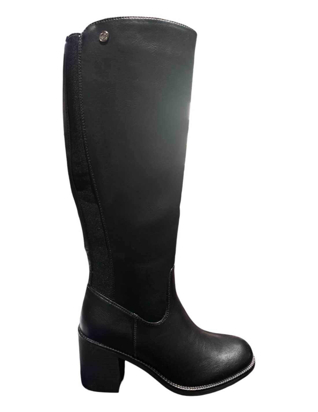 Botas de caña alta combinadas con parte delantera más alta y tacón cuadrado.