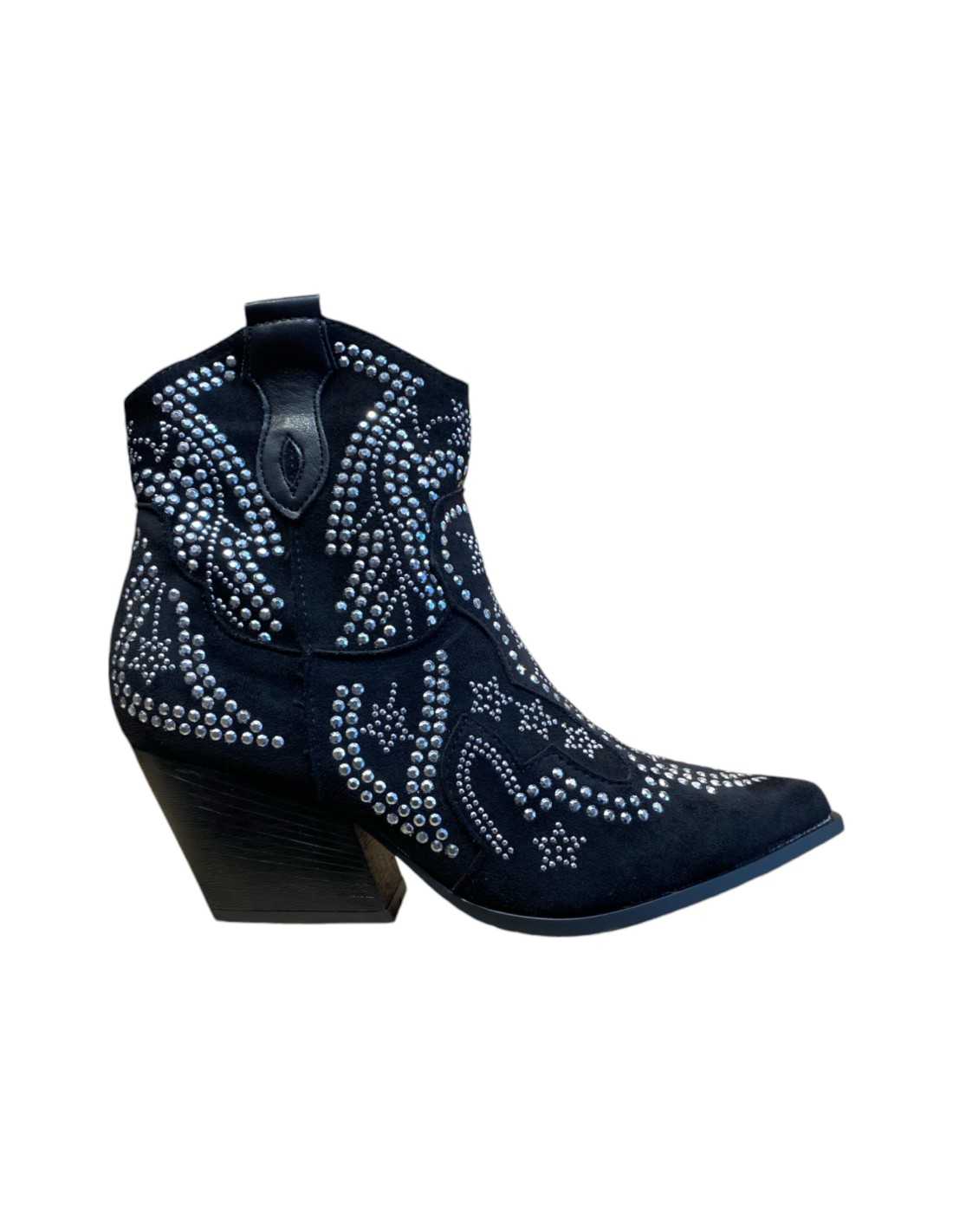 Botines de antelina con remaches decorativos en plateado. Cierre de cremallera, punta fina y tacón cubano.
