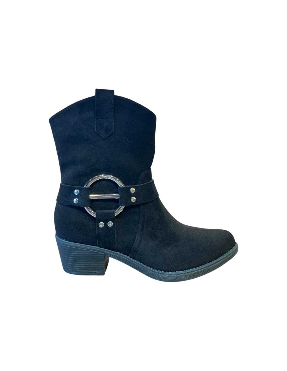 Botines con adorno en parte baja lateral con cierre de cremallera, punta fina y tacón cuadrado.