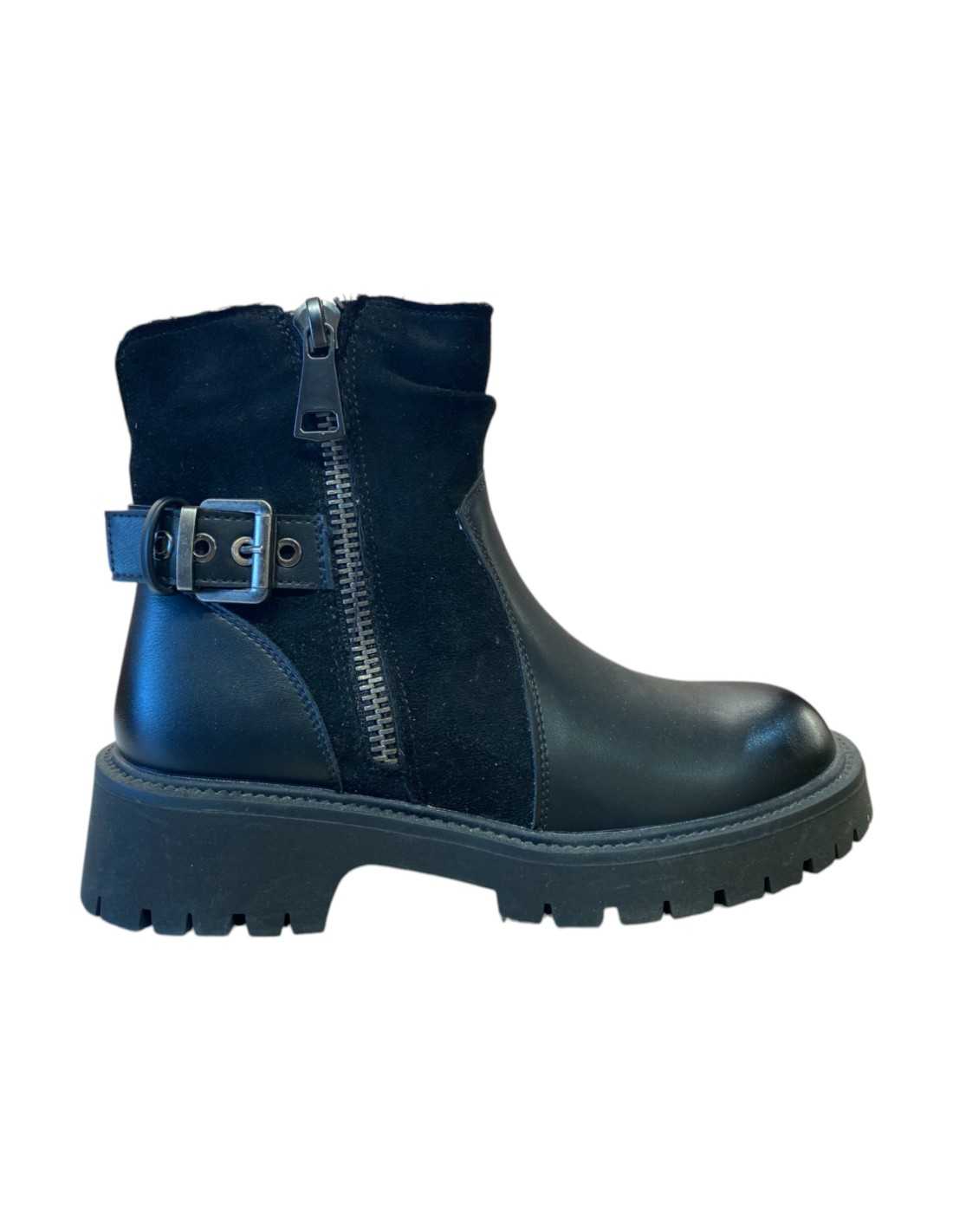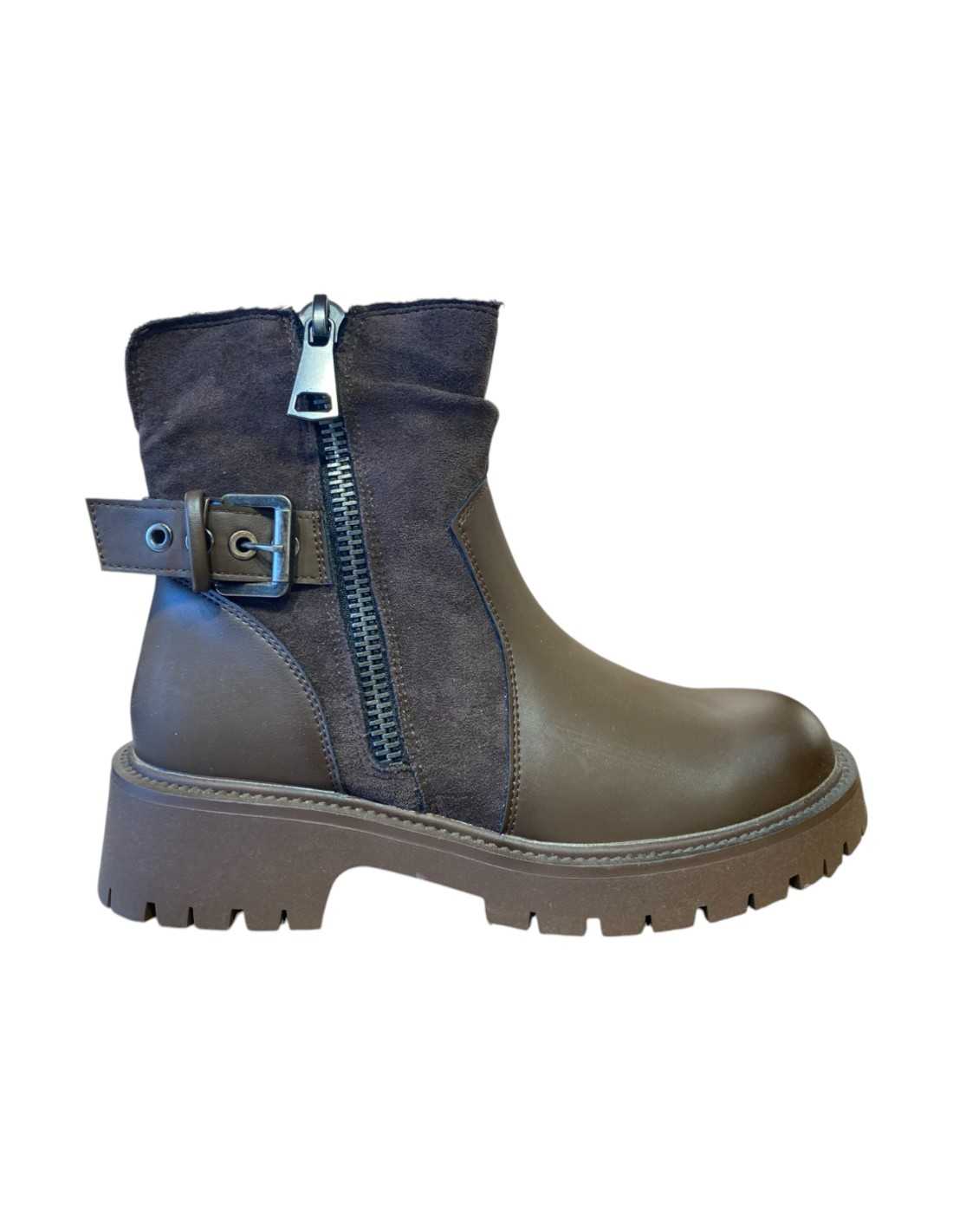 Botines combinados con cierre de cremallera, suela dentada y punta redonda.