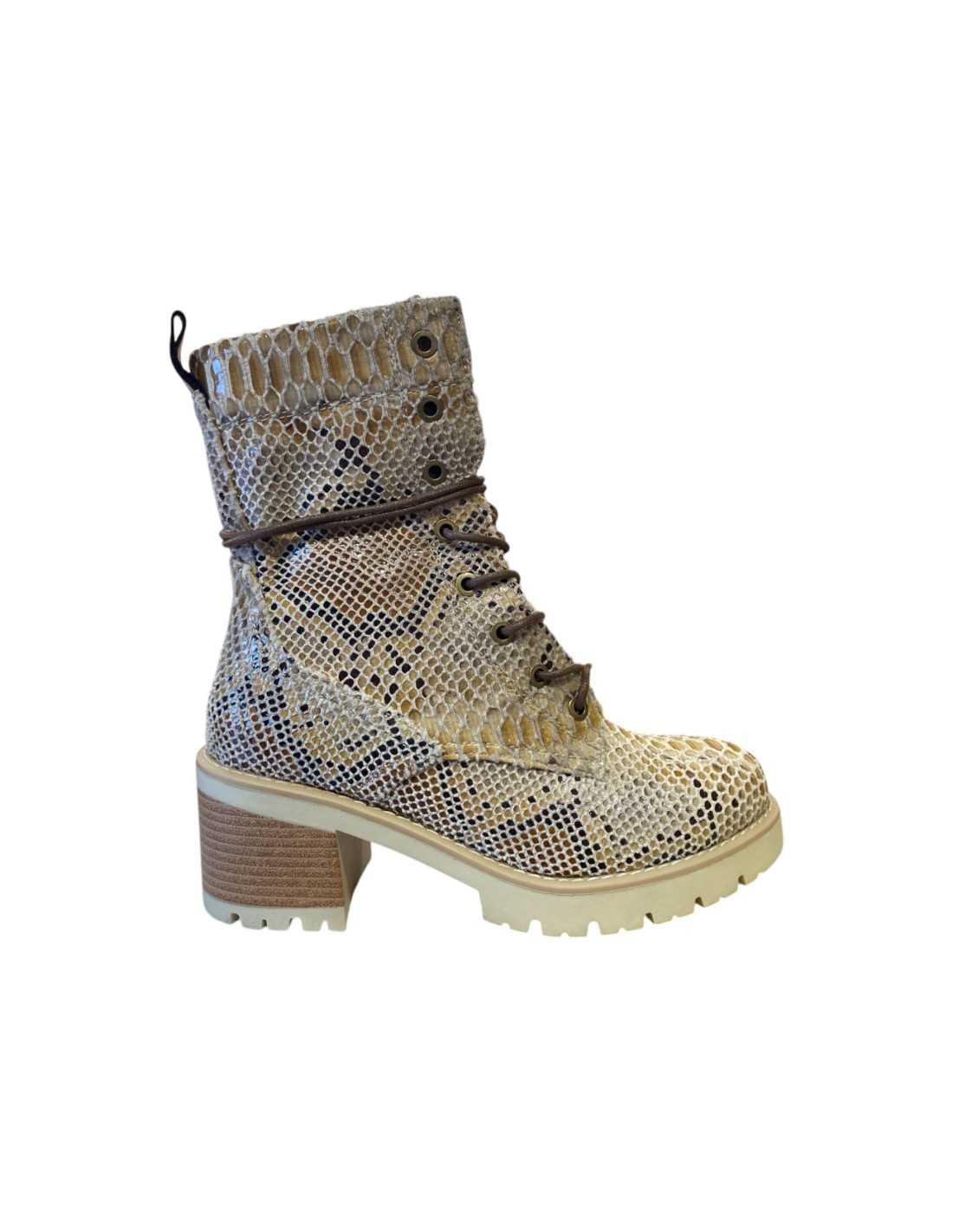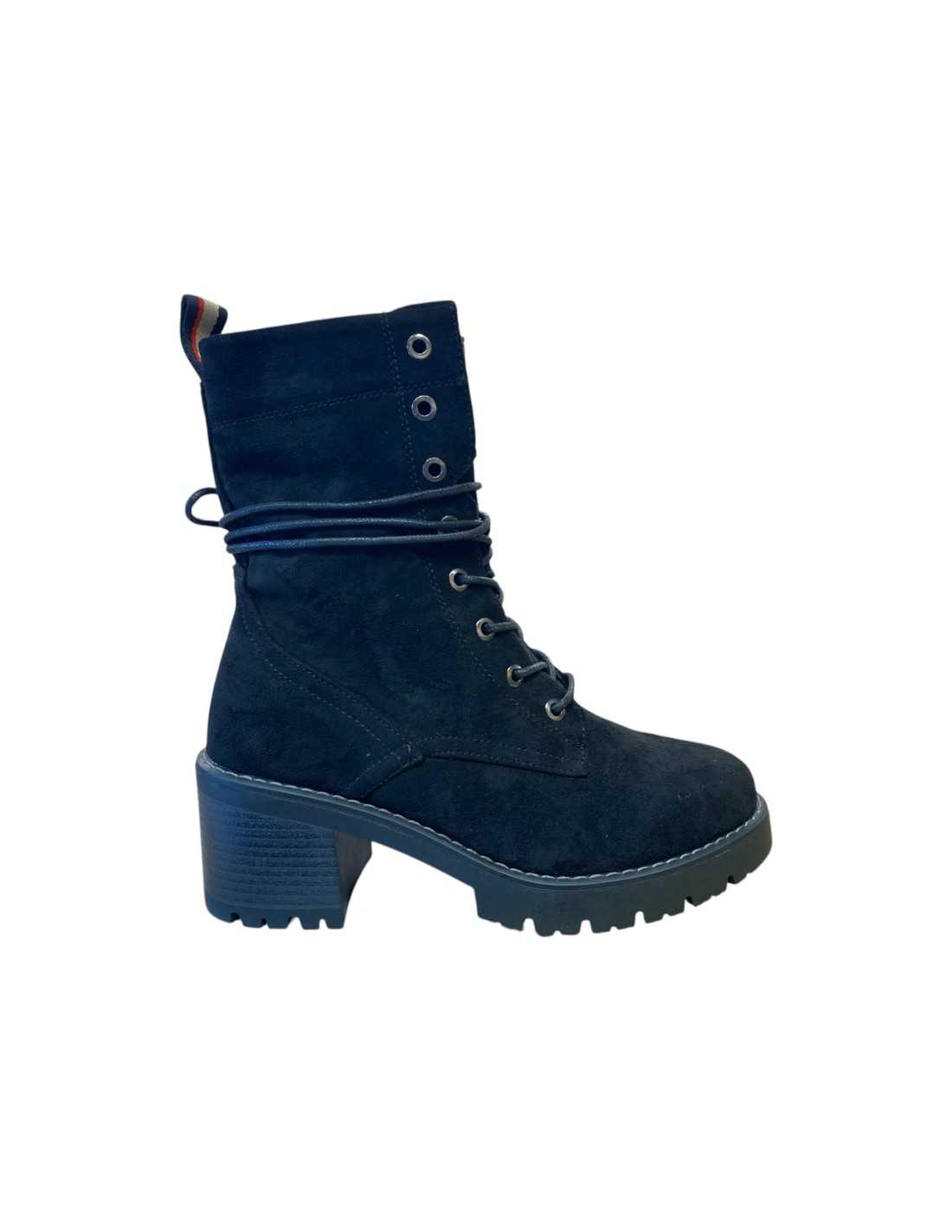 Botines de antelina con cierre de cordones, punta redonda, suela y tacón dentados. Pulsera ancha al tono en parte alta del tobillo.