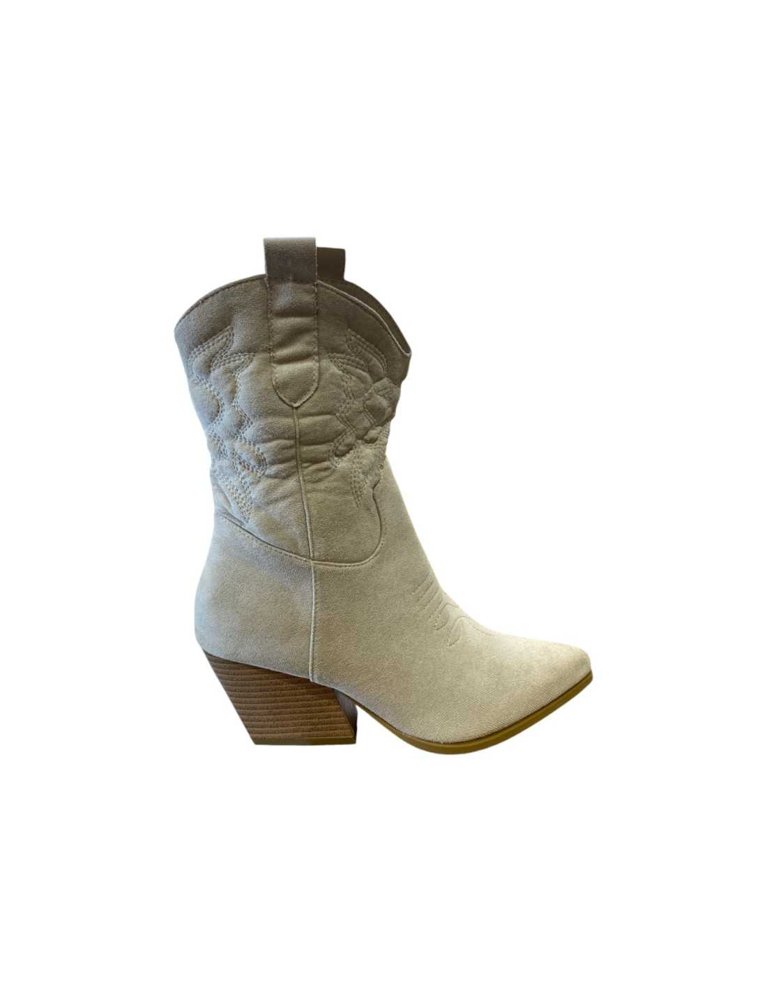 Botines de antelina, estilo cowboy, con tacón cubano y costuras al tono.