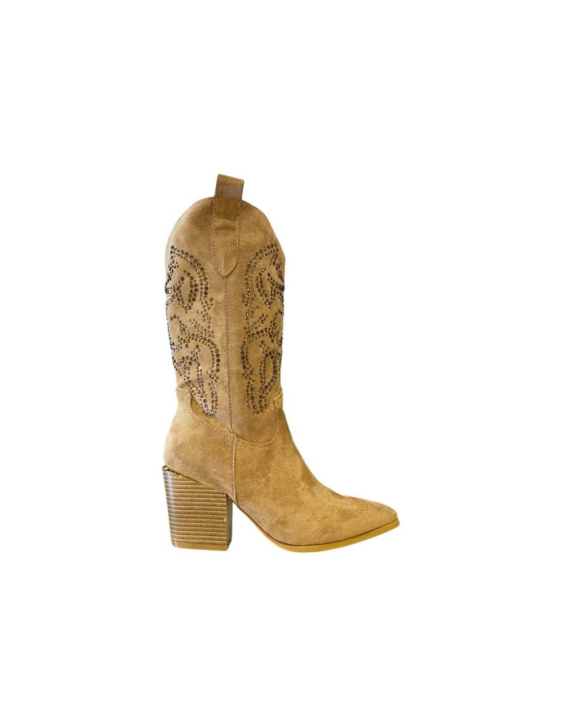 Botas con tacón de madera cuadrado, y caña decorada con strass. Punta fina y cierre de cremallera.