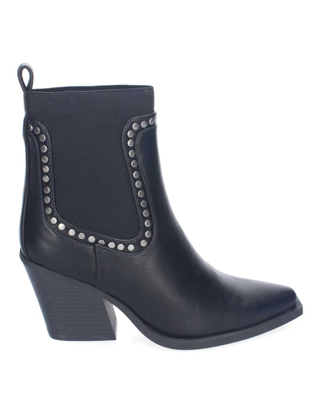 Botines estilo cowboy con tacón cubano, punta fina y tachuelas decorativas alrededor de la caña. Piezas elásticas para fácil calzado.