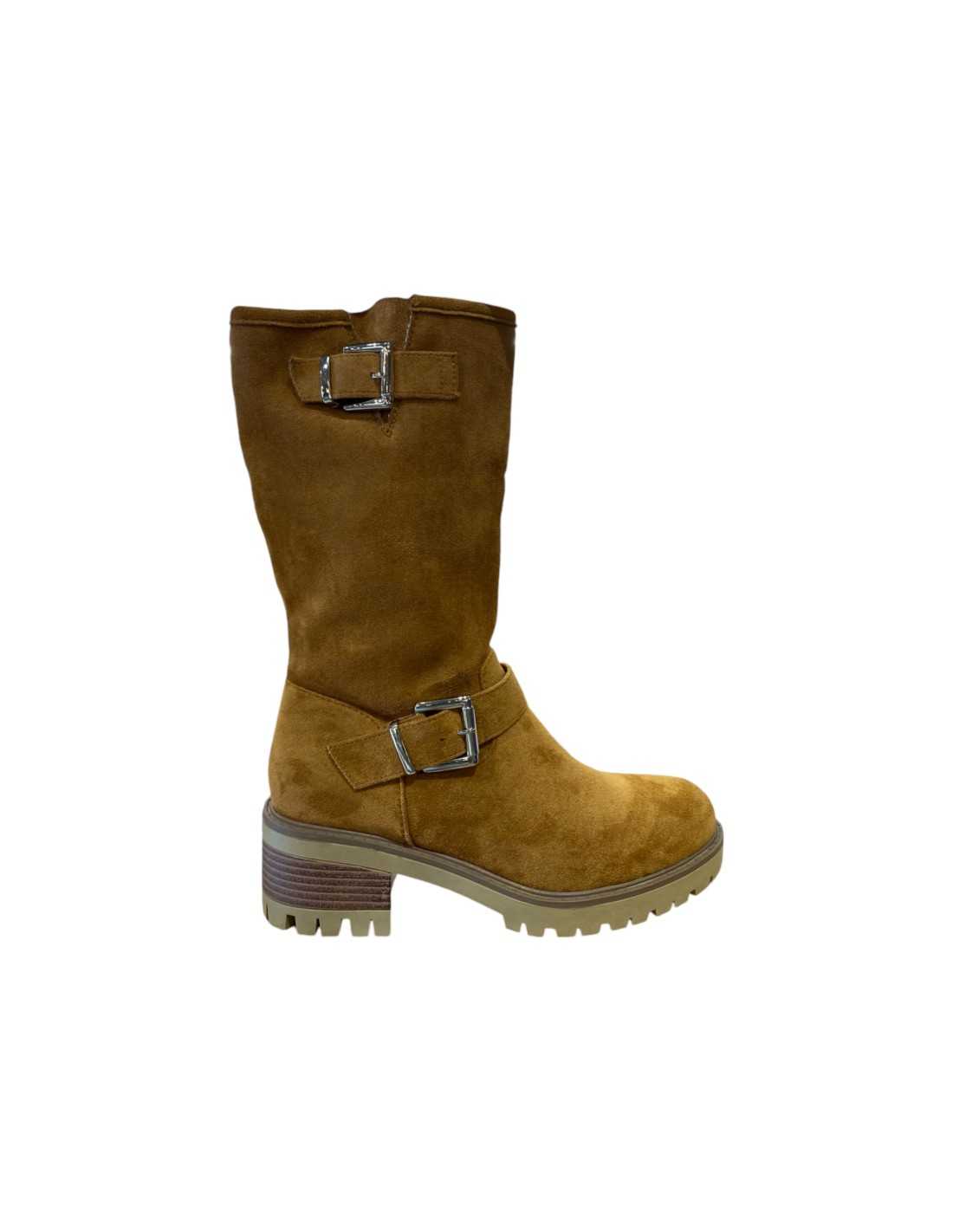 Botas de antelina con punta redonda, cierre de cremallera, y adorno en parte superior de la caña y en tobillo de hebilla.