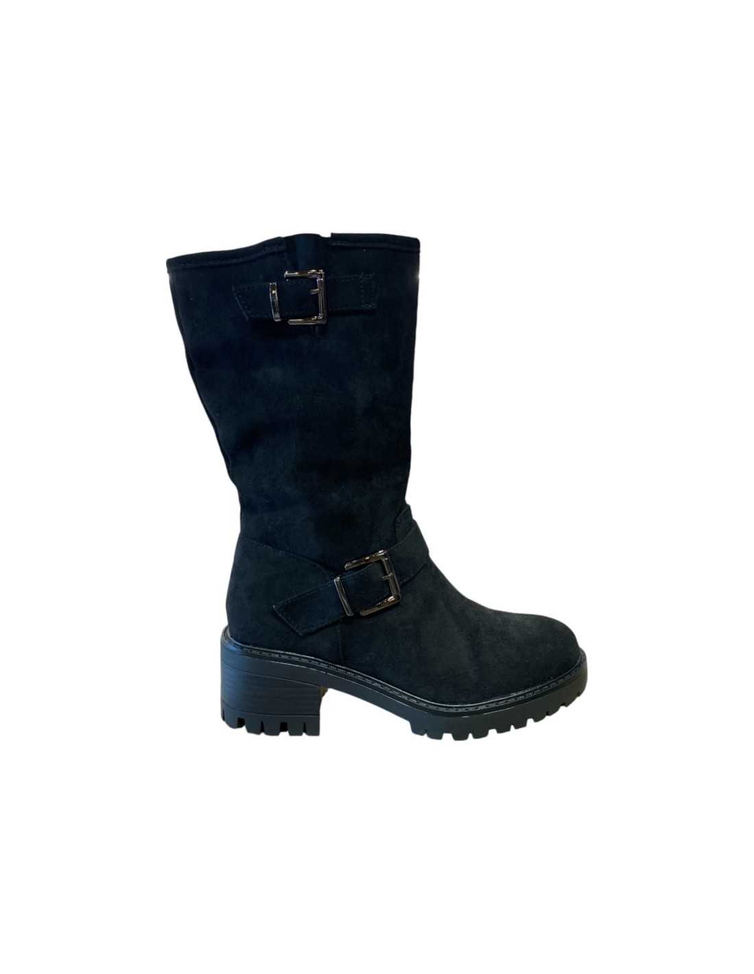 Botas de antelina con punta redonda, cierre de cremallera, y adorno en parte superior de la caña y en tobillo de hebilla.
