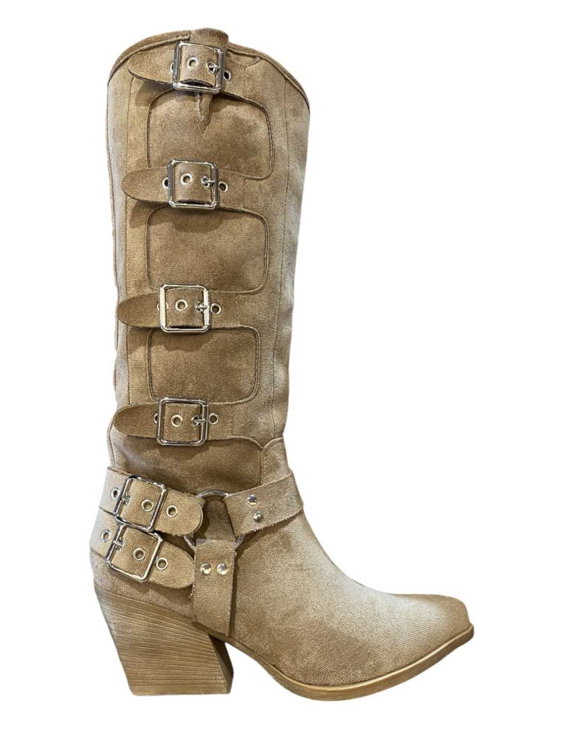 Botas de antelina con 4 hebillas decorativas en caña y 2 en talón. Punta fina y tacón de madera.