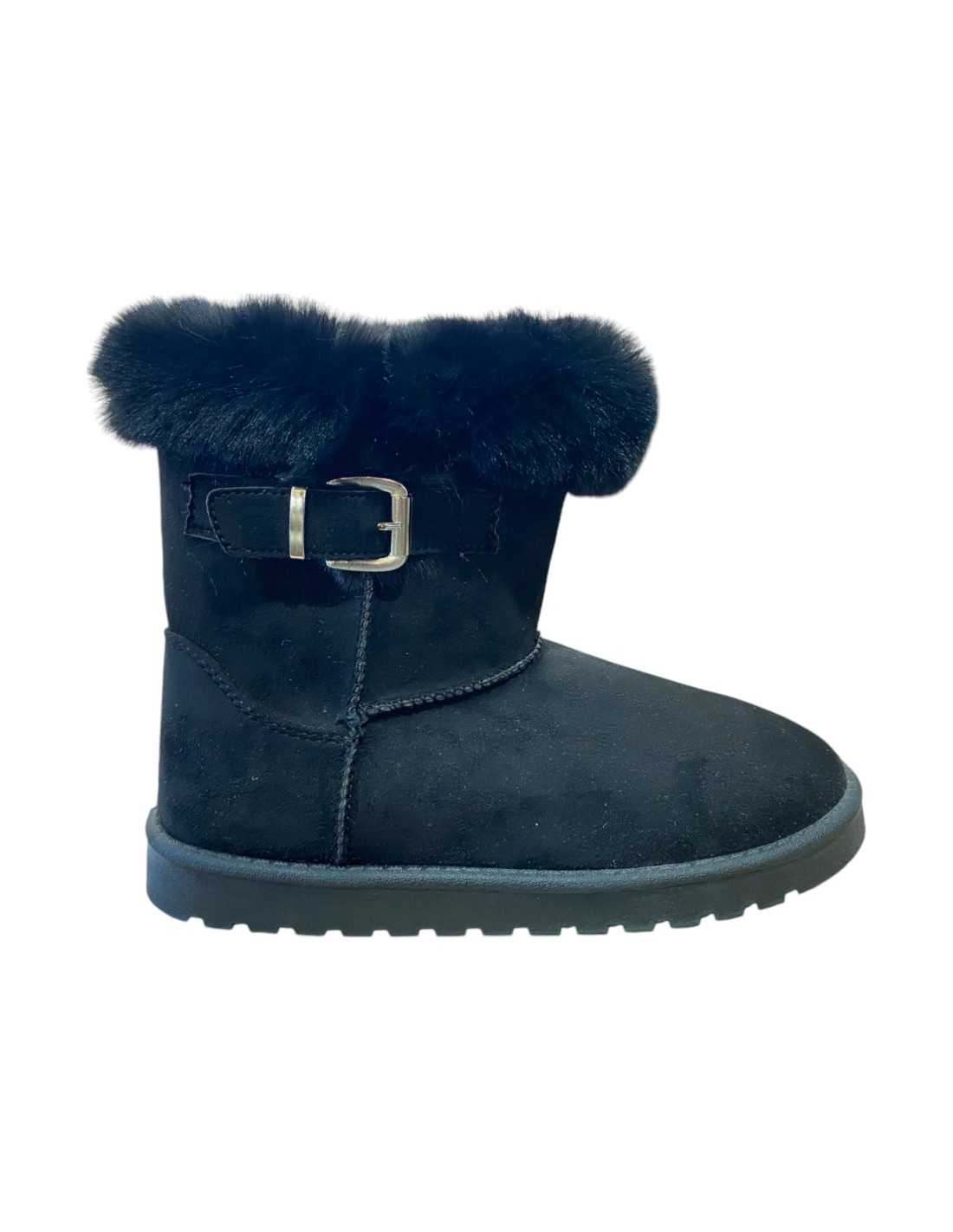 Botines de antelina con pelo sintético en parte superior de la caña. Punta redonda y hebilla lateral.