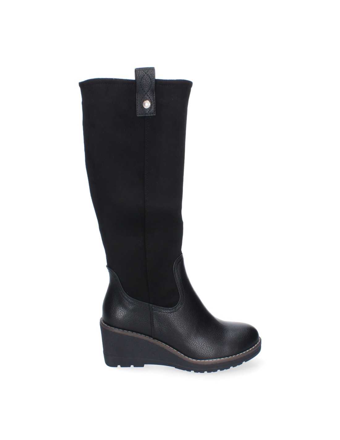 Botas altas combinadas con cierre de cremallera y combinado en materiales. Con cuña para mayor comodidad.