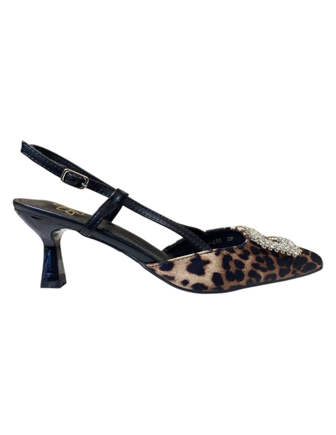 Zapatos de tacón fino, con empeine trenzado, broche de strass en punta y hebilla en talón.