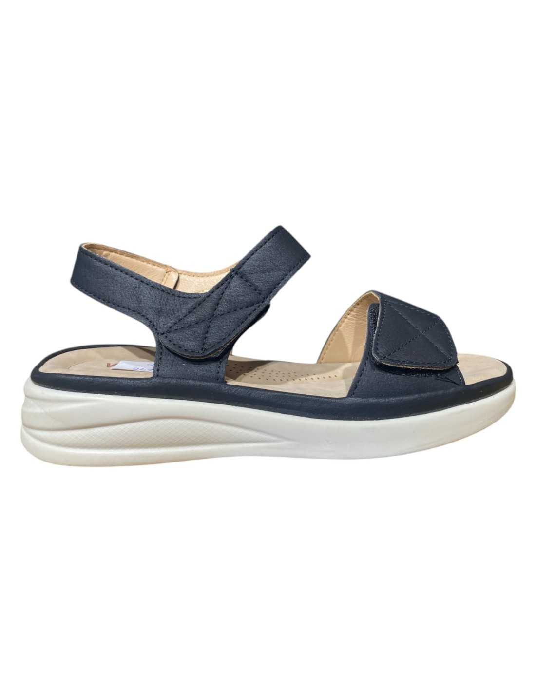 Sandalias planas con doble cierre de velcro y pala recta. Suela confort. Destalonada, con costura decorativa.