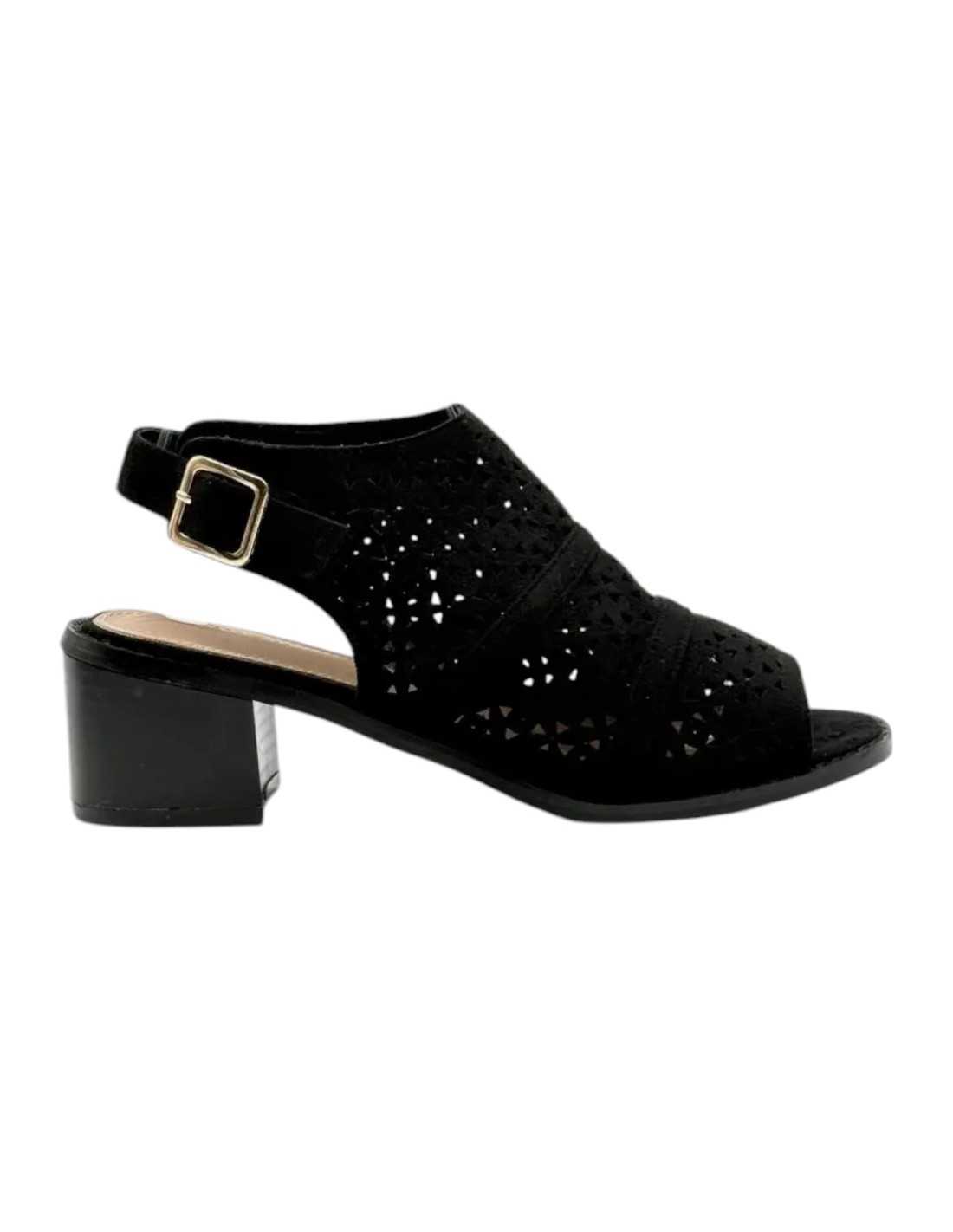 Botines calados con talón y punta descubiertos. Cierre de hebilla en lateral.
