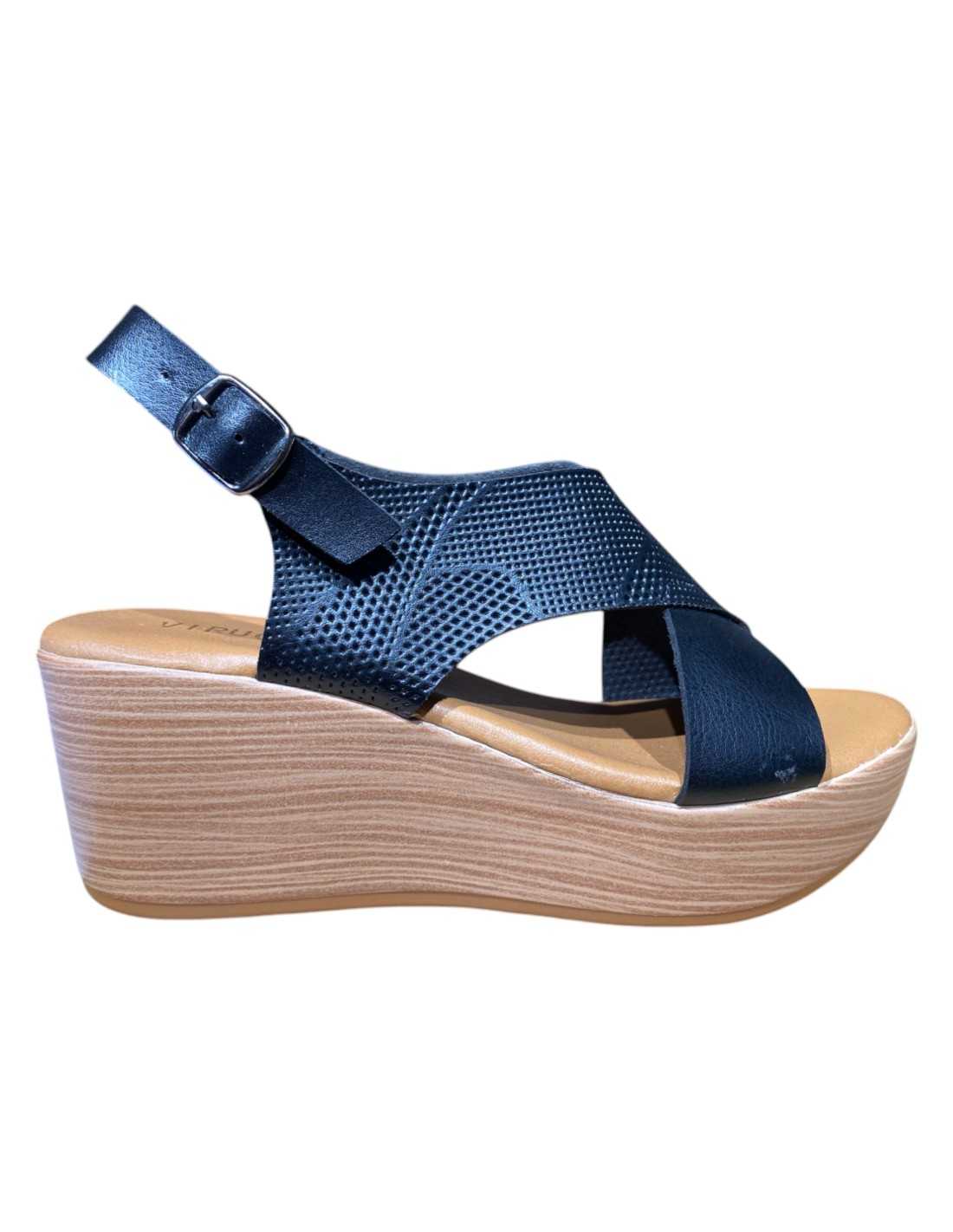 Cuñas con plataforma imitación a madera, con empeine ancho cruzado y cierre de hebilla trasero.