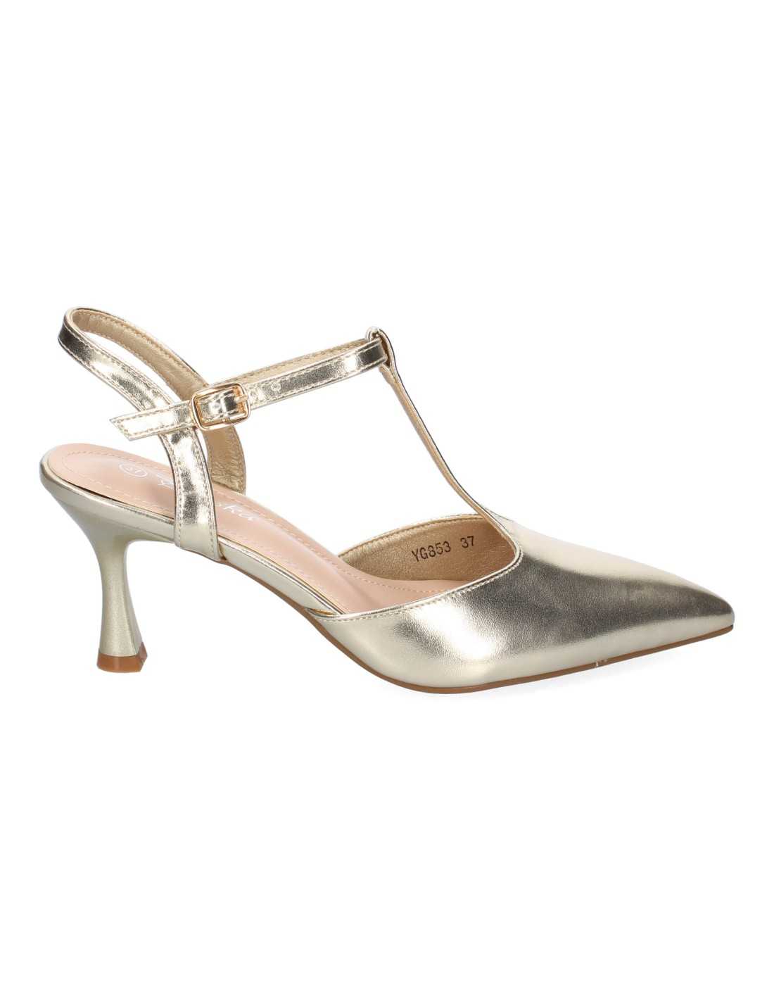 Zapatos de tacón y punta fina con tira en el empeine y cierre de hebilla en tobillo.