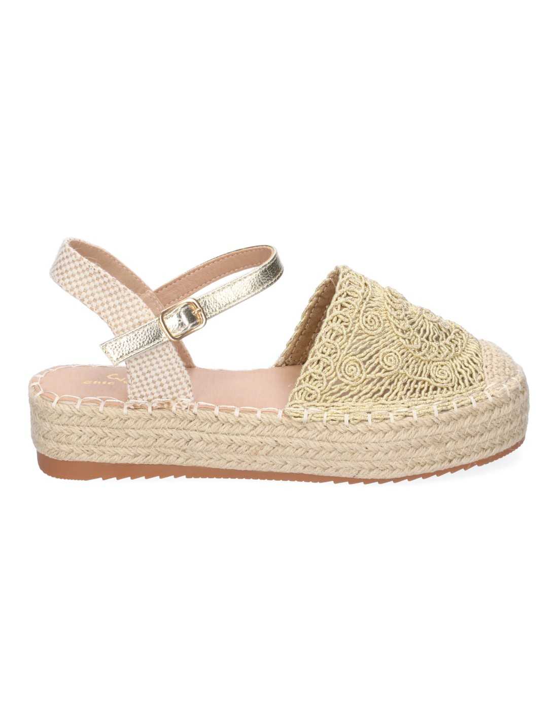 Sandalias de plataforma con suela de yute y empeine de ganchillo y punta en ganchillo. Cierre de hebilla en tobillo y talón descubierto.