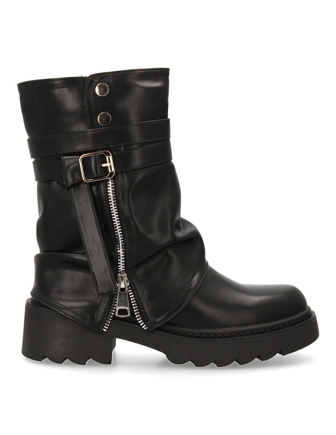 Botín militar con cremallera, suela de plataforma dentada y adorno de hebilla en tobillo.