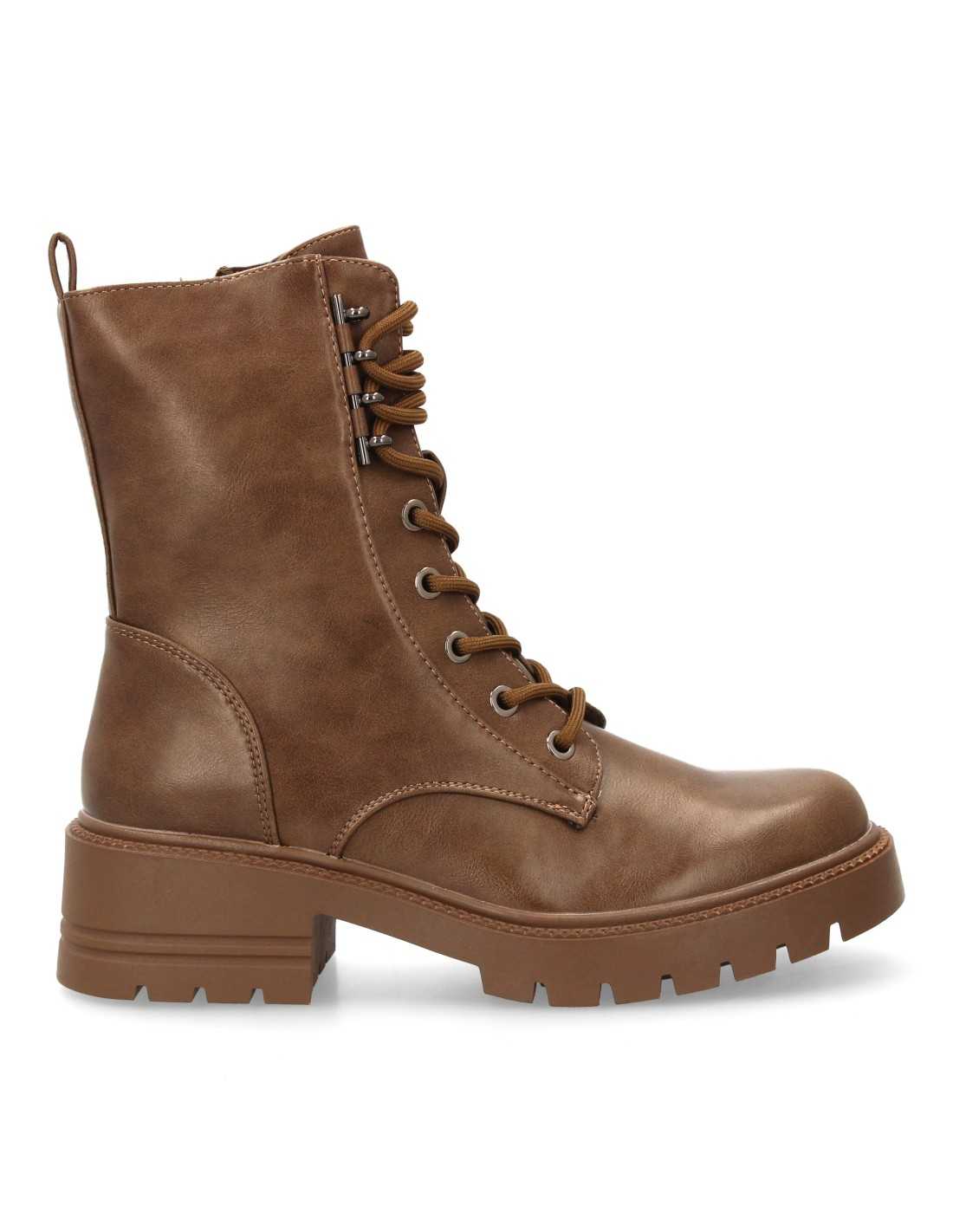 Bota estilo militar con cordones delanteros con detalles metálicos y suela gruesa. Cierre de cremallera.