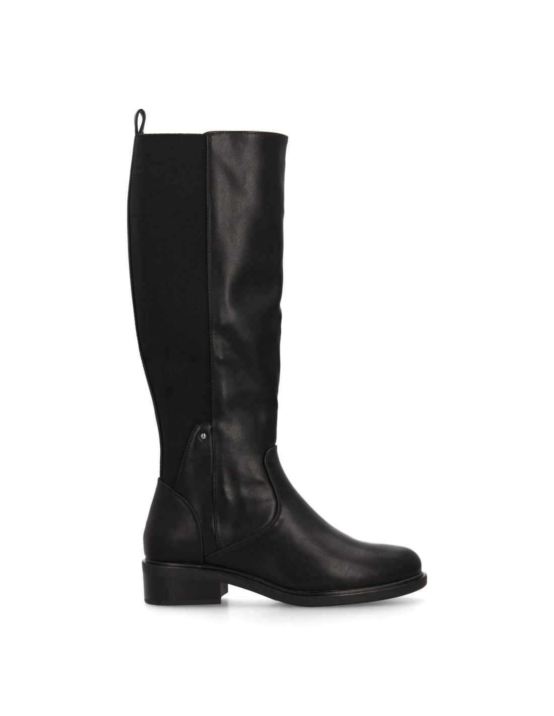 Bota alta con caña elástica en la parte trasera que se adapta perfectamente a la pierna para una mayor comodidad. Estampado liso y cierre de cremallera, suela plana con tacón bajo.