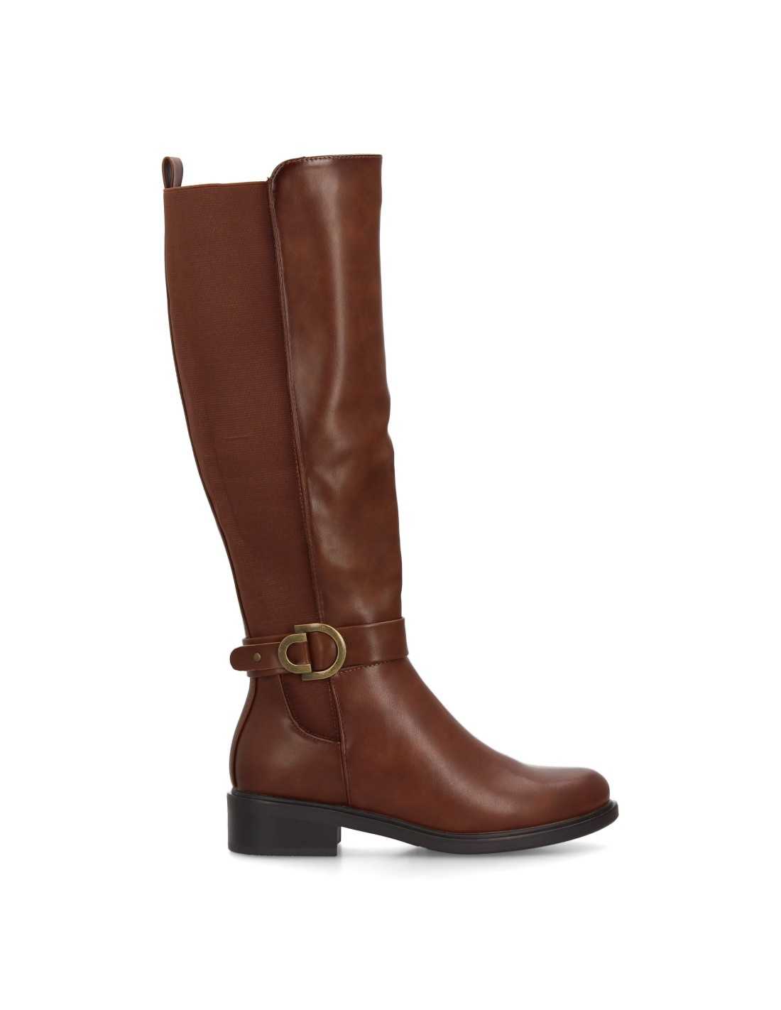 Bota alta de mujer con caña lisa para mujer. Cierre de cremallera, suela plana con tacón bajo. Hebilla decorativa.