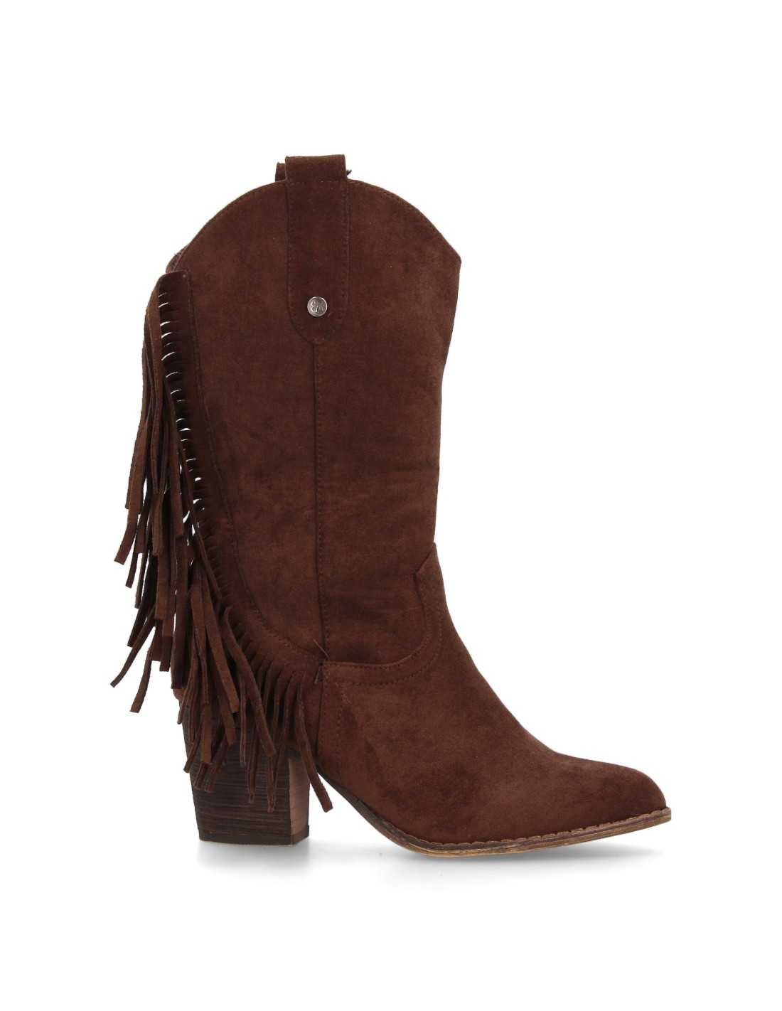 Bota estilo cowboy con detalle de flecos laterales y tacón ancho de altura media. Cierre lateral con cremallera y tiradores.