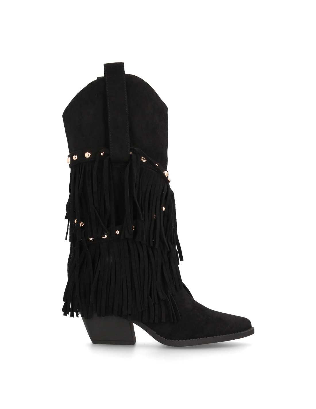 Bota campera de caña alta decorada con flecos en cascada. Con tachuelas metálicas, punta fina y tacón cubano.