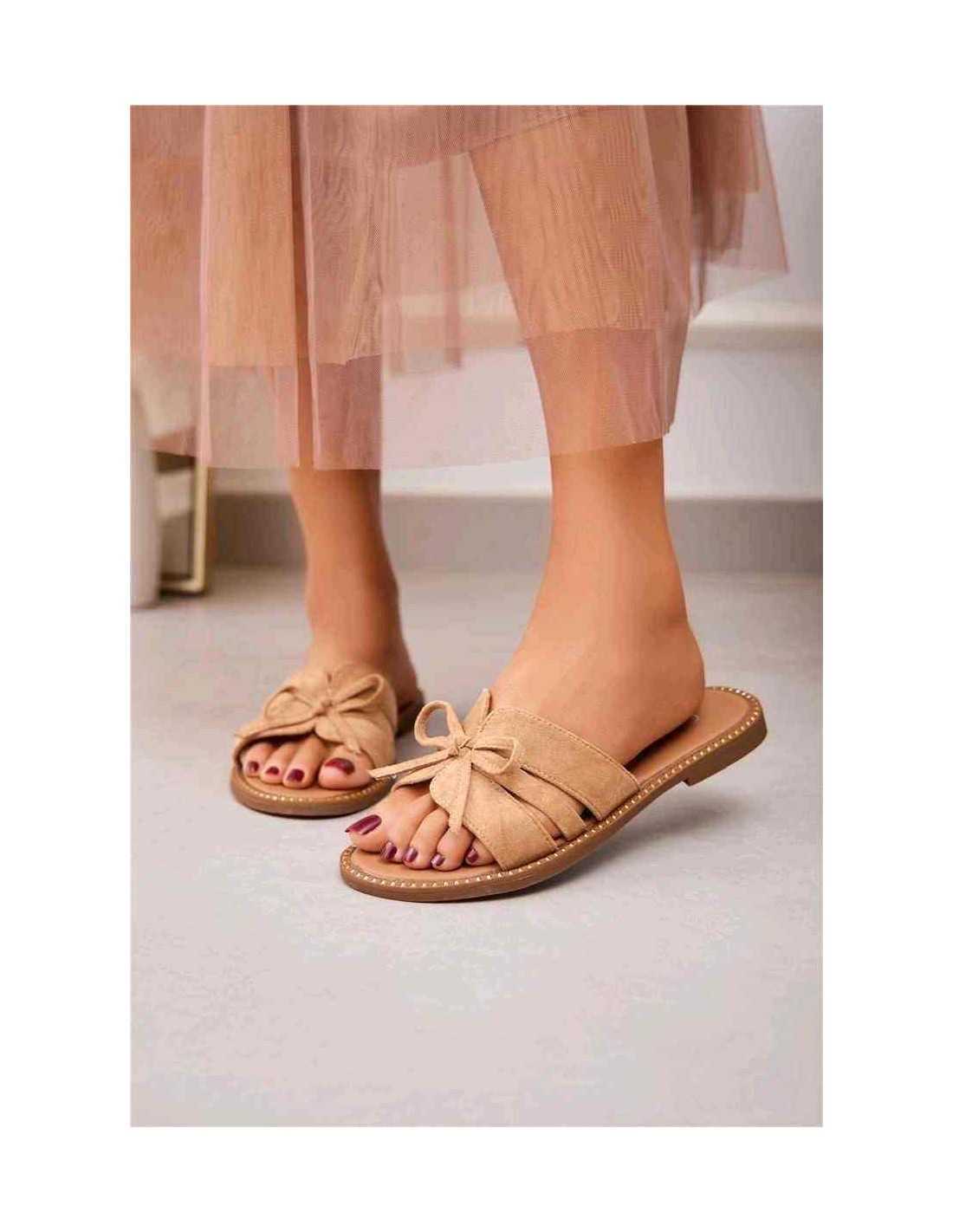 Flat sandals with suede upper in two pieces, with a central bow in the same tone.