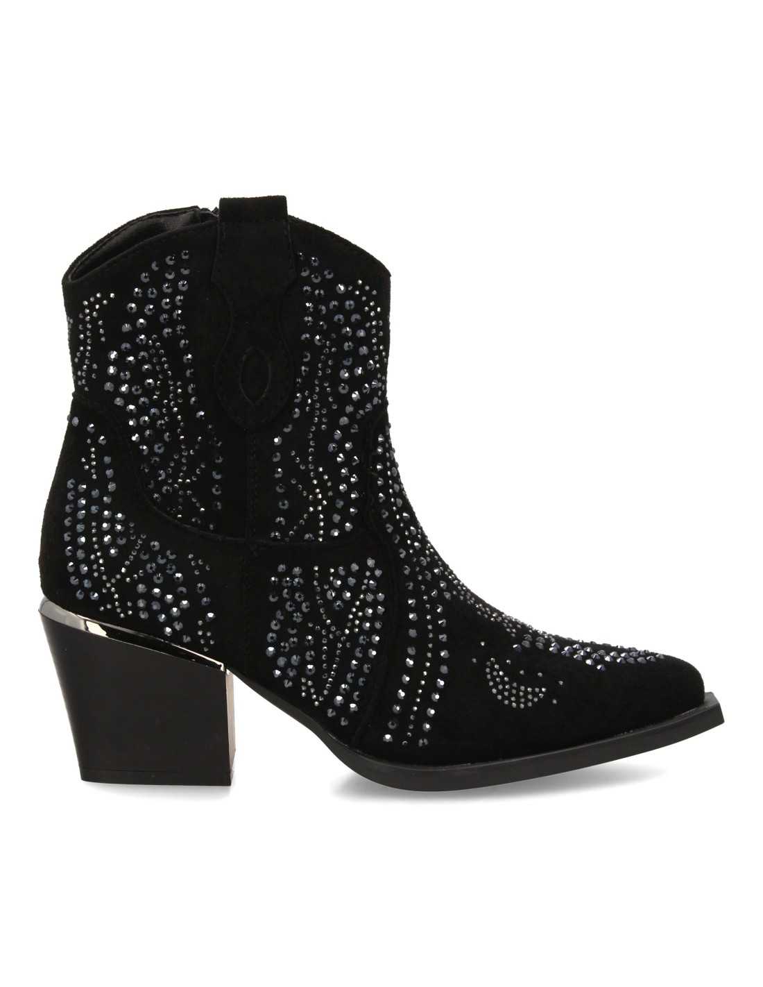Ankle boots with shiny studs, gold-tone heel embellishment, and zipper closure.