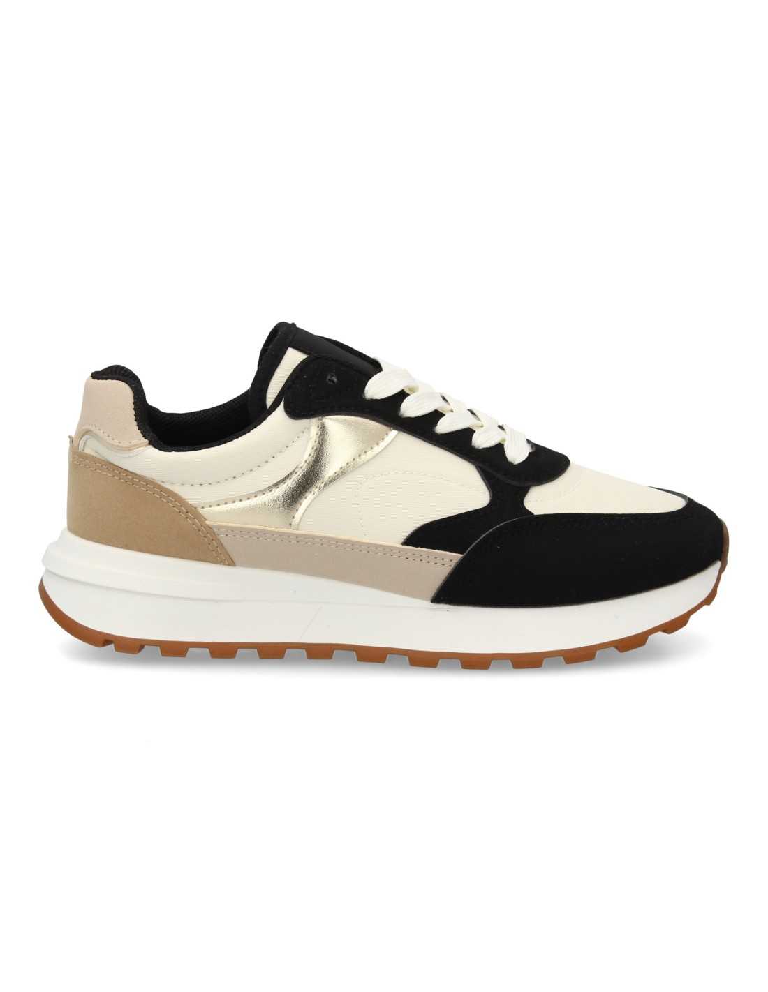 Sneakers with a combination of suede and glitter textures and materials. Lug sole and lace-up closure. A very versatile and versatile design.