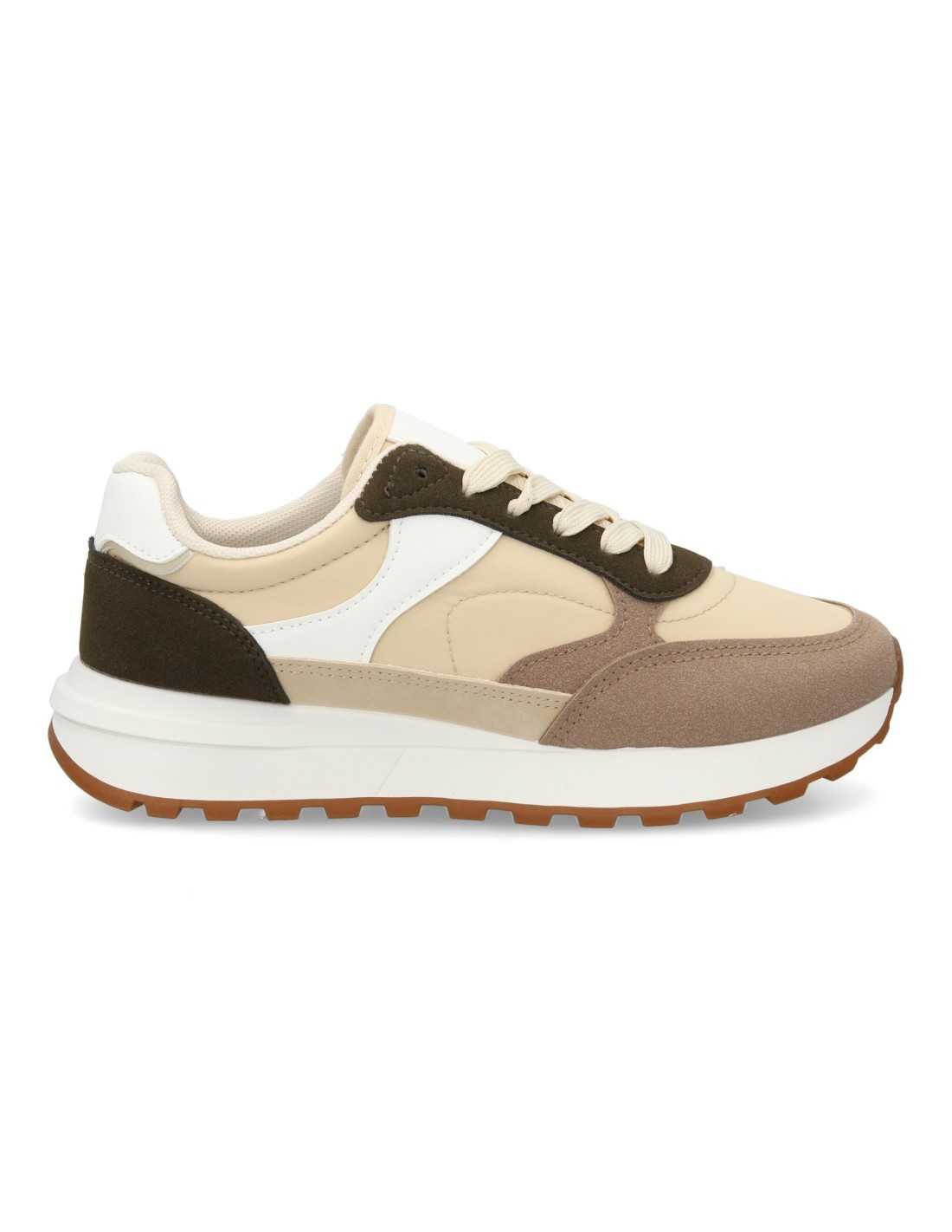 Sneakers with a combination of suede and glitter textures and materials. Lug sole and lace-up closure. A very versatile and versatile design.