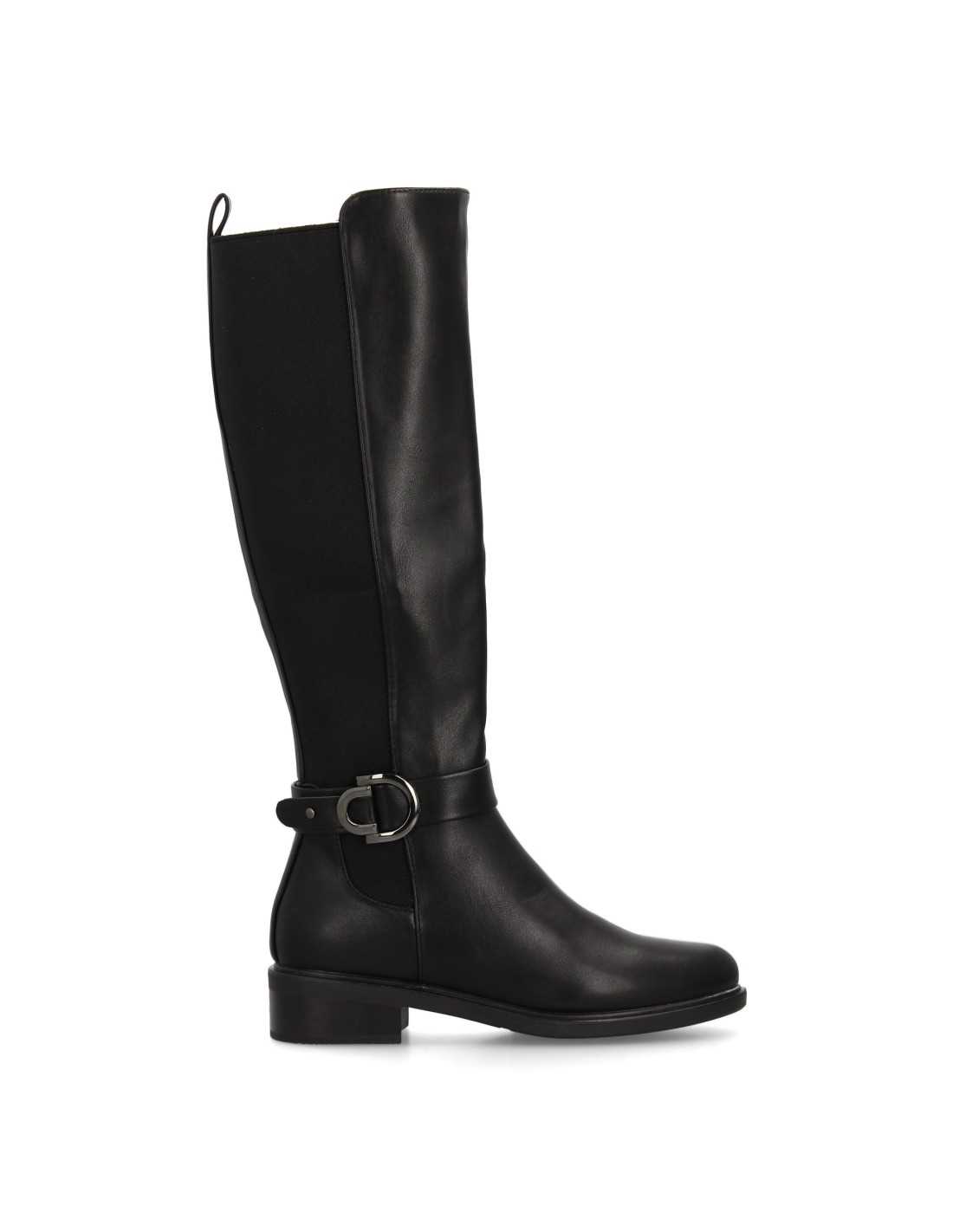 Women's knee-high boot with a smooth shaft. Zip closure, flat sole, and low heel. Decorative buckle.