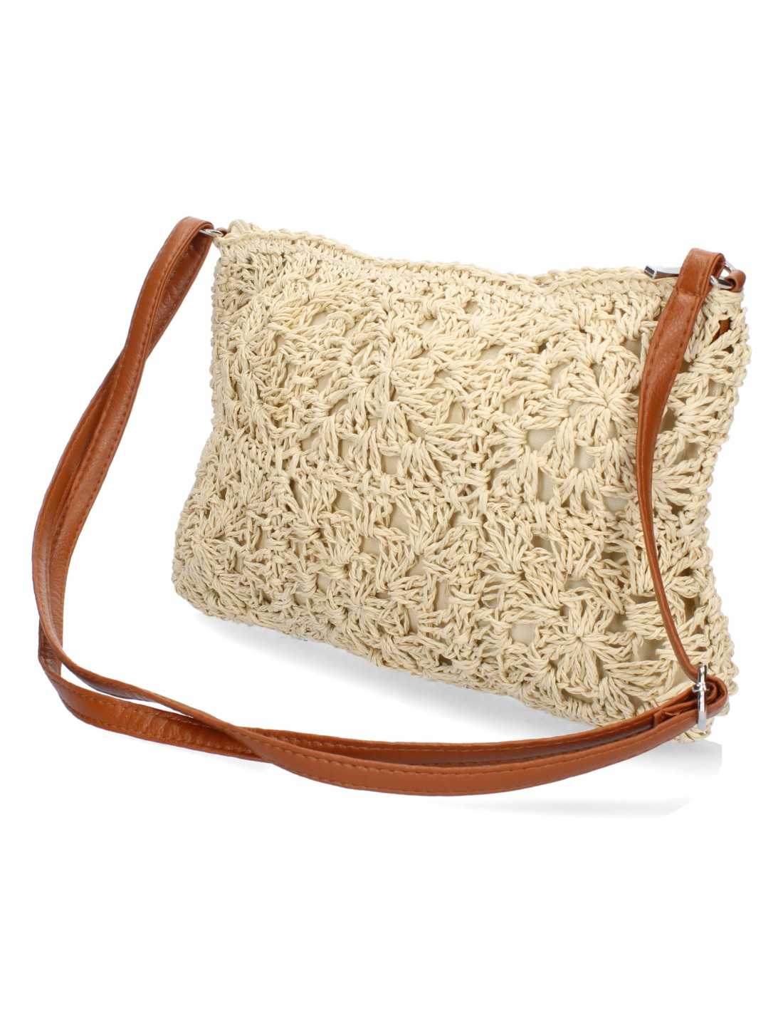 Bandolera confeccionada en rafia. Cierre de cremallera para acceder a su interior. La parte interna esta forrada y contiene un bolsillo. Asa efecto cuero regulable.