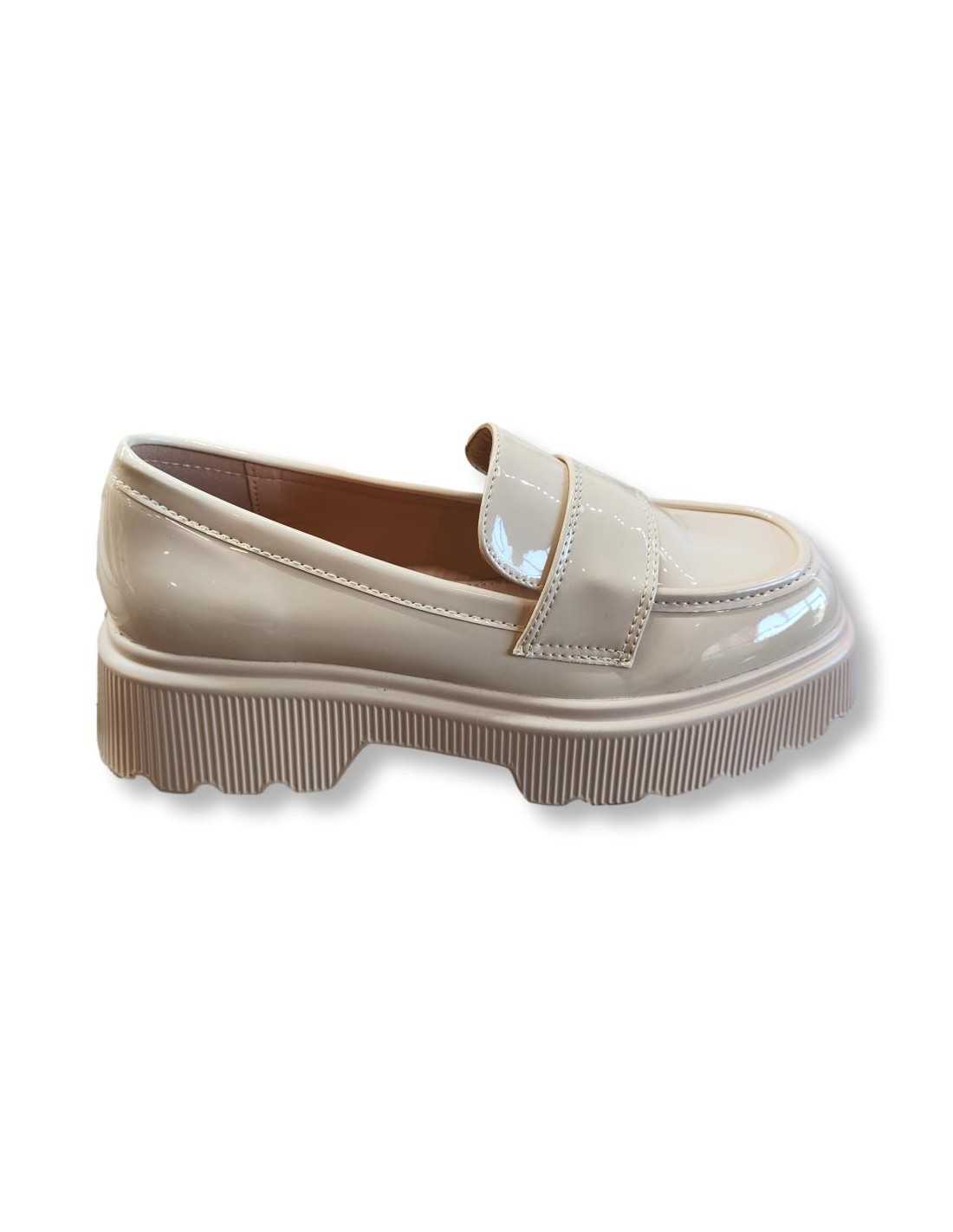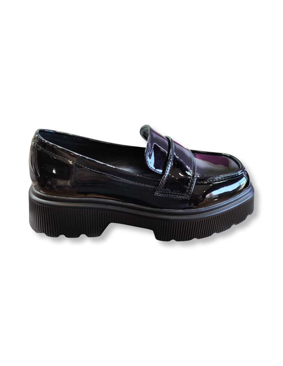 Sapatos de salto alto, estilo mocassim de couro envernizado, com tira no peito do pé combinando.