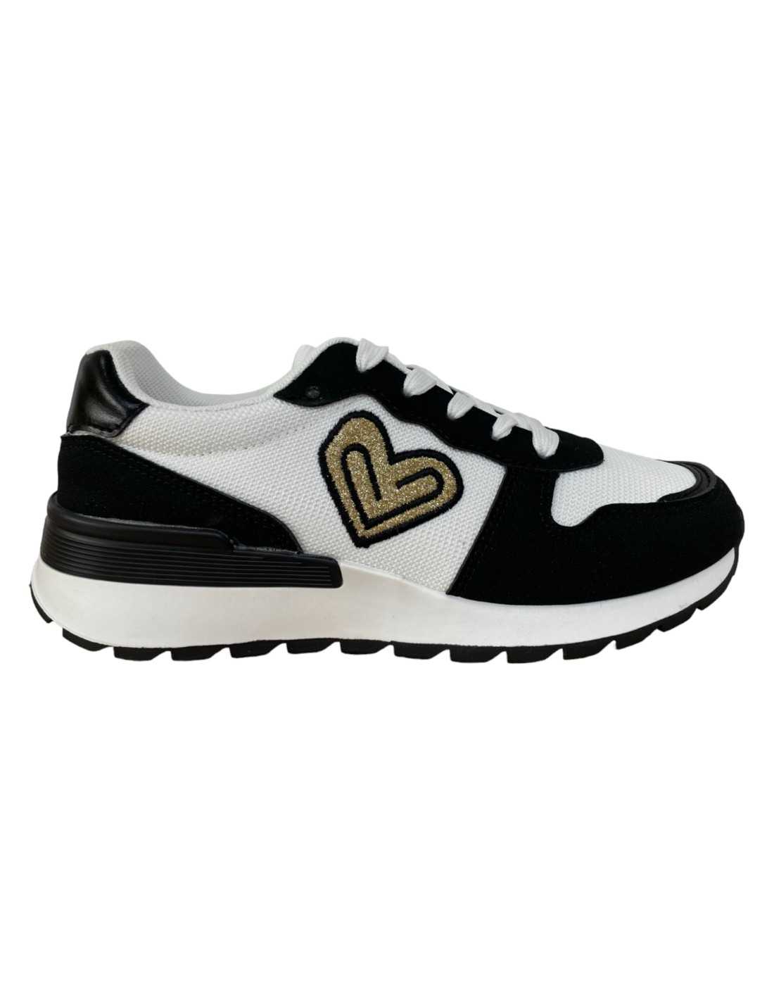 Tênis com cunha, com coração decorativo na lateral, bordado e calcanhar e biqueira na mesma cor. Fecho de renda.