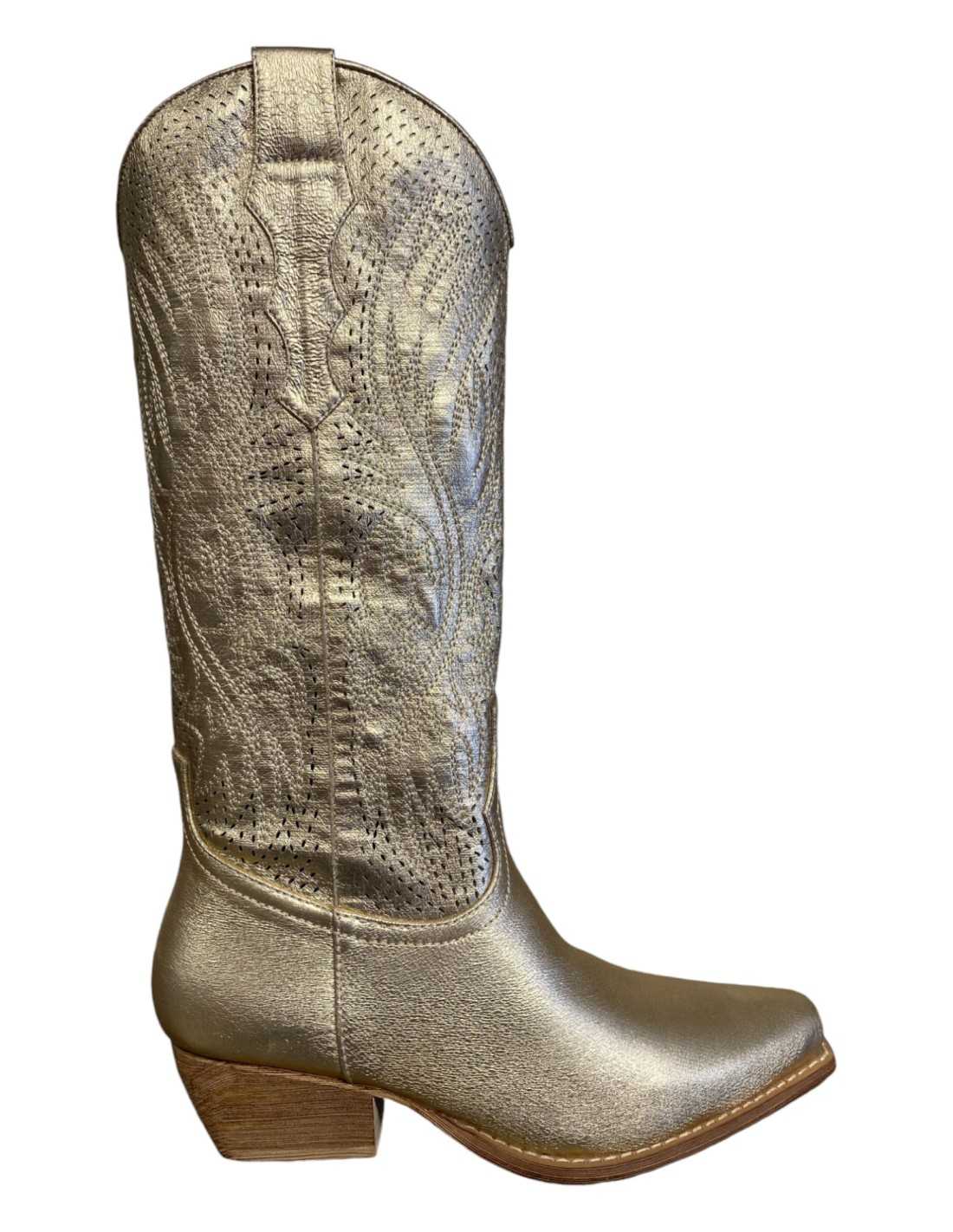 Botas country de cano alto, bico fino e salto médio.